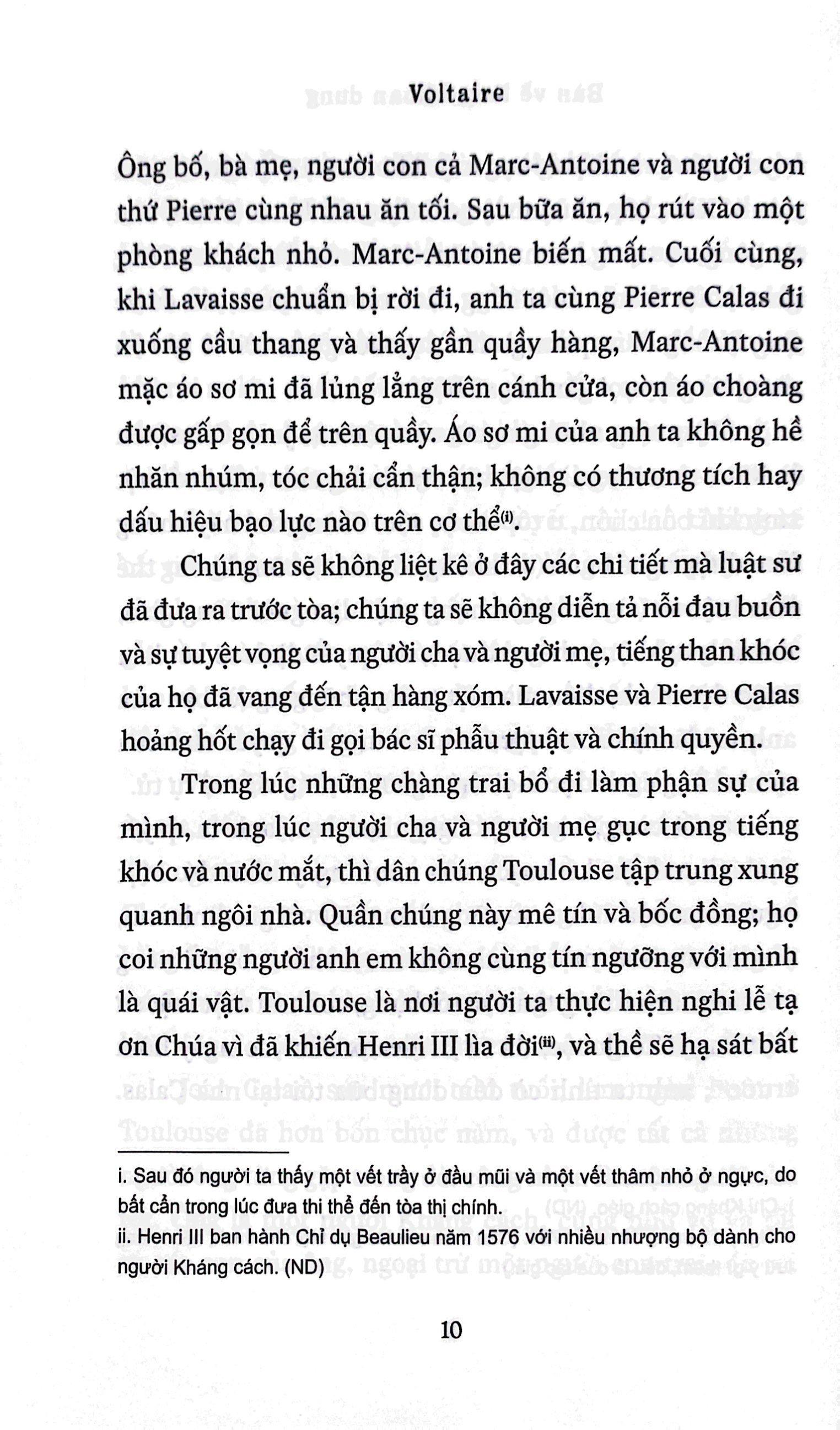 Bị buộc tội sát hại chính con trai của m.ình, Jean Calas, một tín đồ Kháng cách ở Toulouse, phải chịu hành hình trên bánh xe tử thần còn gia đình ông thì lâm vào cảnh khốn đốn. Vụ việc đầy tai tiếng này thực chất là hệ quả của sự bất khoan dung ở những kẻ cuồng tín muốn trừng phạt những ai không cùng tín ngưỡng với m.ình.