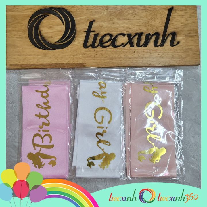 Băng đeo chéo sinh nhật chữ Birthday Girl Chất liệu: polyester satin Kích thước: 9,5 x 80 cm Chữ Birthday Girl được ép kim màu vàng sáng bóng Phụ kiện cho tiệc sinh nhật, phụ