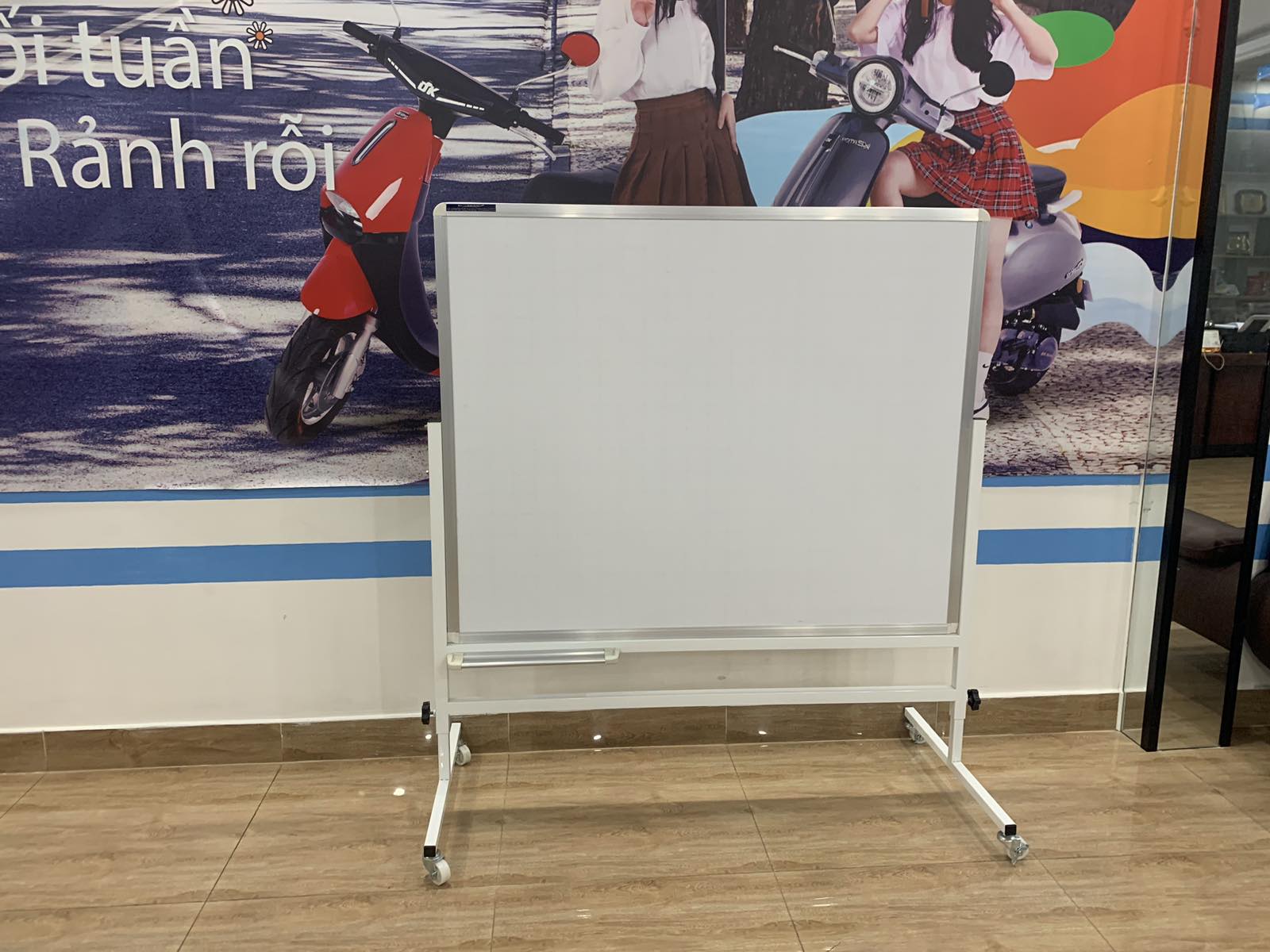 5. Chân bảng di động được làm bằng sắt sơn tĩnh điện màu trắng rất hài hòa với mặt bảng, được làm bằng sắt vuông 3 x 3cm hoặc 2 x 4 cm sơn tĩnh điện màu trắng sữa tạo cho bảng sang trọng và chắc chắn, phía dưới chân bảng có bốn bánh xe Taiwain có thể di chuyển hoặc gài cố định.