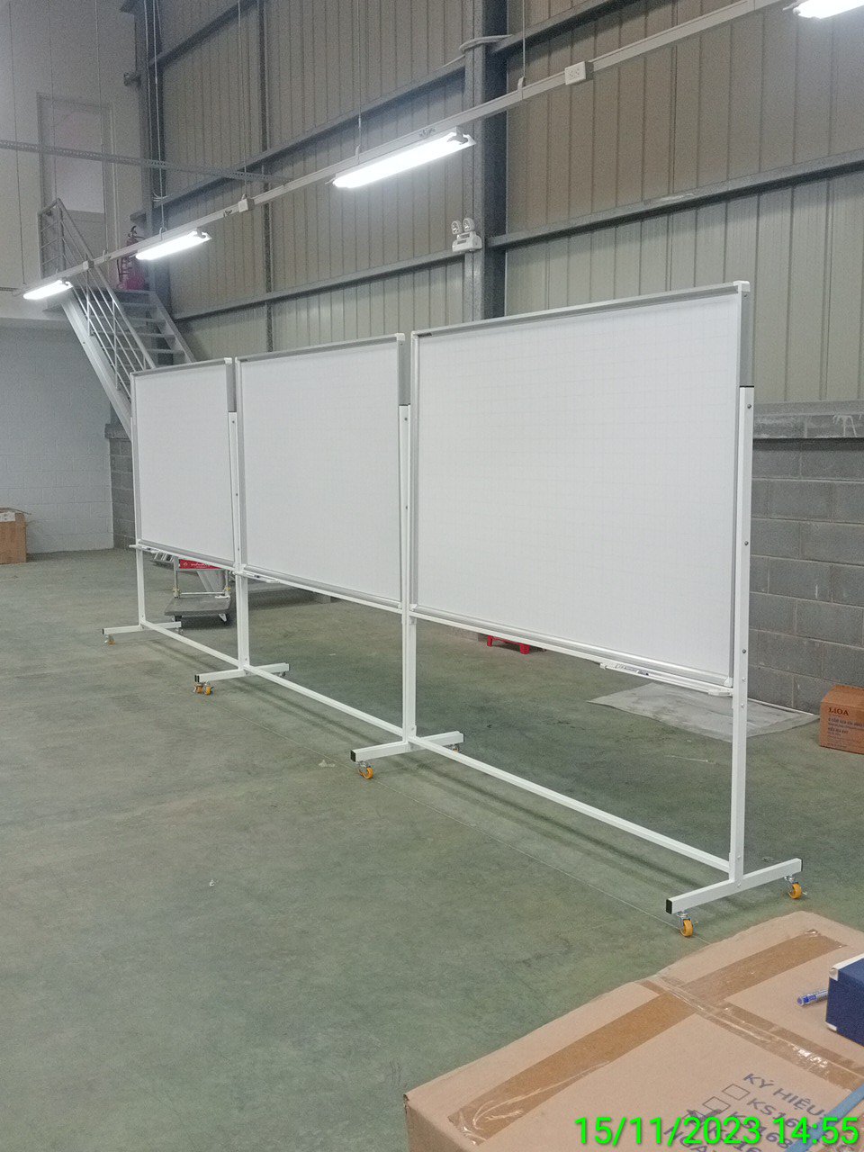 BẢNG: – Mặt bảng: Màu trắng dùng để viết bút lông, được nhập khẩu từ Đài Loan, viết lau dễ dàng, không để lại vết hằn trên mặt bảng. Kẻ ô ly hoặc để trơn theo yêu cầu. – Tấm lót bảng: bằng ván MDF ép giấy bóng vân gỗ chống ẩm, chống cong mo và đảm bảo bảng viết không bị rung hoặc bằng tấm nhựa dầy 10ly chống nước, chống cong mo. – Khung/bo bảng: bằng nhôm Việt Nhật chuyên dụng chống oxy hóa. – Co góc: Bốn góc bảng có co nhựa màu sắc hài hòa, chống bị trầy xước. – Máng phấn/ đựng bút: dài 50cm, bằng nhôm chuyên dụng, hai đầu có co nhựa. CHÂN BẢNG: – Bằng sắt 2x4cm dầy 1,2ly, sơn tĩnh điện màu trắng sữa, lắp ráp được. – Bánh xe: bảng có gắn 4 bánh xe của Taiwan màu trắng cao cấp, có thể cài cố định được.