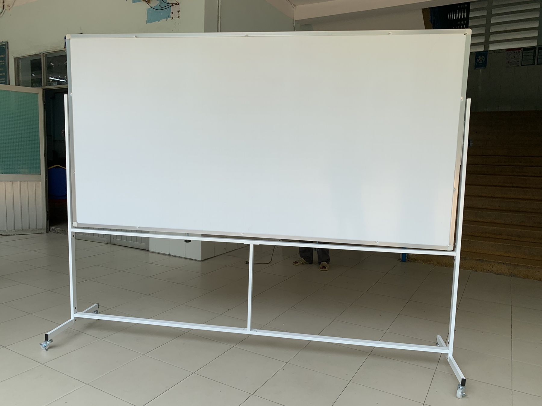 Bảng có 2 mặt, kích thước mặt bảng là 1.2x2.4m Cấu tạo sản phẩm: BẢNG: – Mặt bảng: Màu trắng dùng để viết bút lông, được nhập khẩu từ Đài Loan, viết lau dễ dàng,