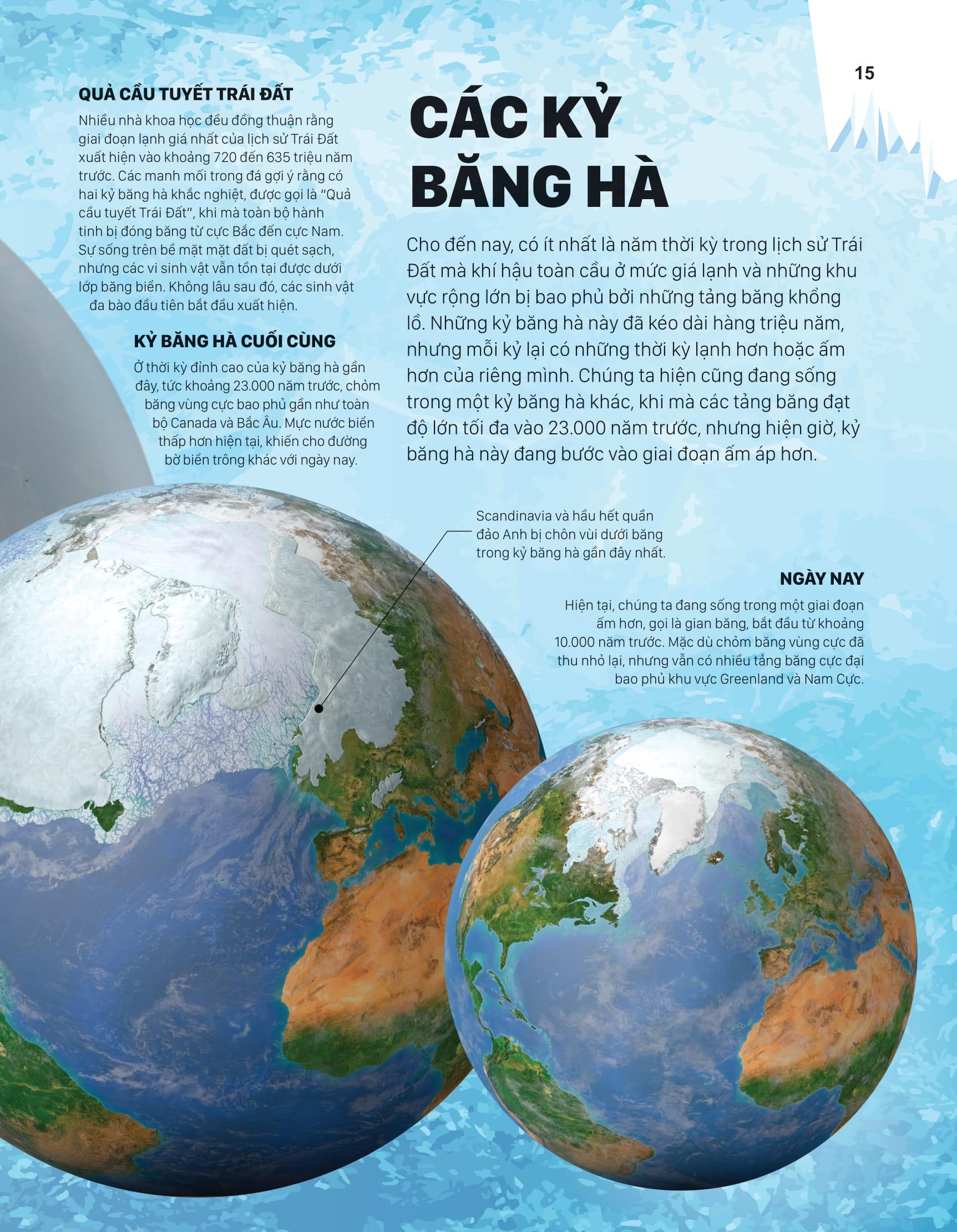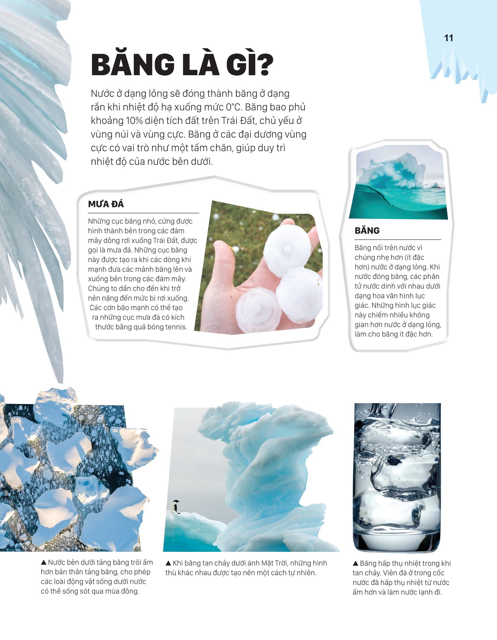 Cuốn sách đặc biệt này sẽ đưa bạn khám phá cách mà động vật, thực vật và con người sinh tồn tại ở những ""vương quốc băng giá"", quan sát quá trình sông băng hình thành và chiêm ngưỡng những hang động kỳ vĩ trong bă Nào, chúng ta hãy cùng bước vào chuyến hành trình tuyệt vời qua các hệ sinh thái đẹp đẽ nhất nhưng cũng nguy hiểm nhất thế giới này nhé.
