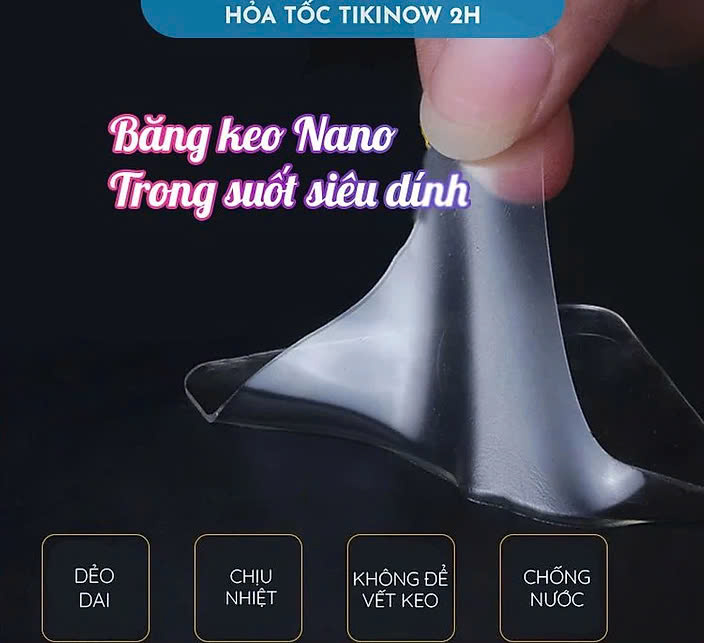 Điểm nổi bật: - Băng keo dán nano 2 mặt siêu dính là sản phẩm hoàn toàn mới lạ nhưng lại vô cùng hữu ích trong sinh hoạt hằng ngày với tính đa năng: Dán