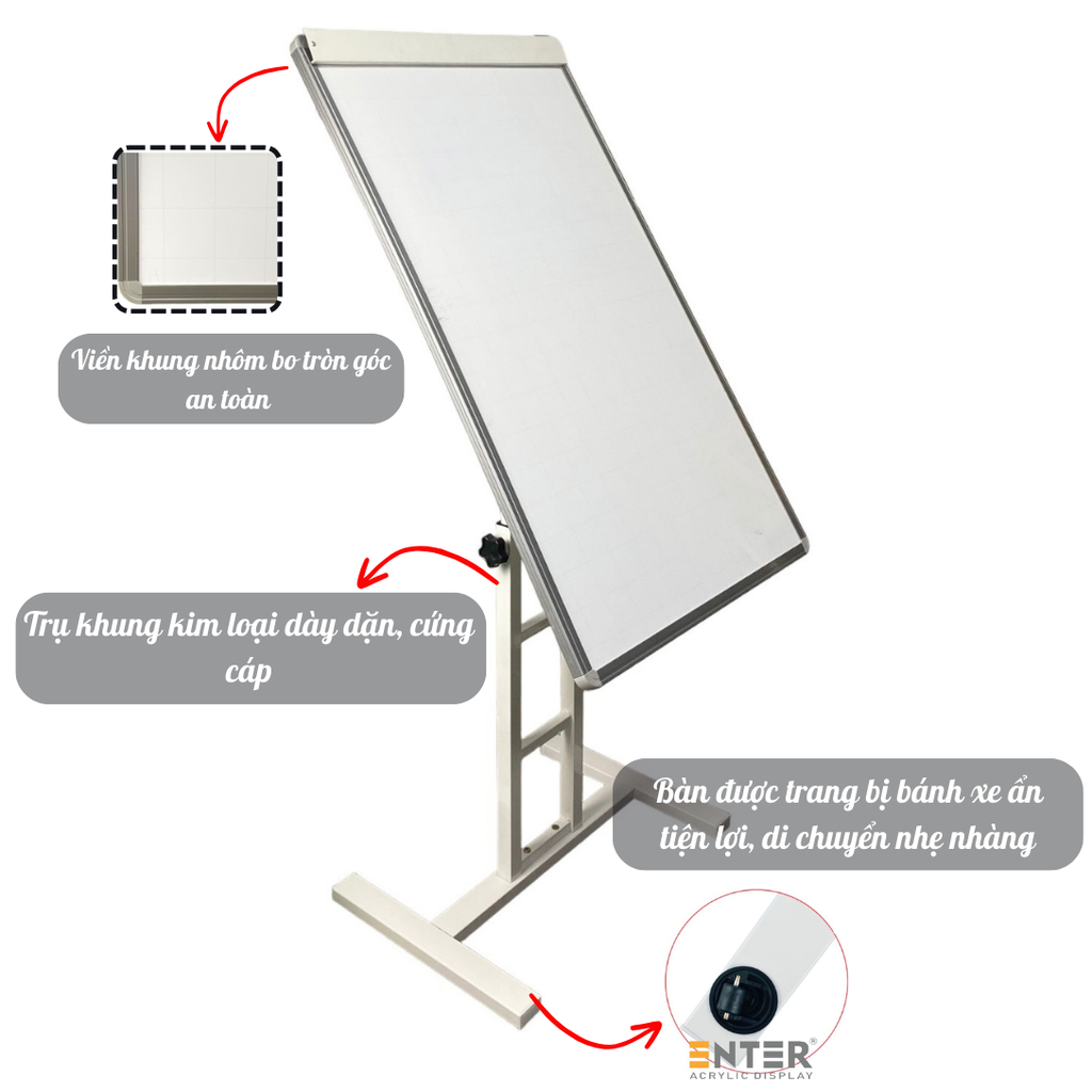 Bảng di động Enter KT303 được làm từ kim loại giúp bàn đứng vững, cứng cáp. Ngoài ra, mặt khung bảng được thiết kế điều chình xoay 360 độ, chân bàn còn được trang bị bánh xe giúp việc sử dụng, di chuyển và điểu khiển hướng đi dễ dàng, có thể nhanh chống gấp gọn sau khi dùng, không chiếm nhiều diện tích không gian.