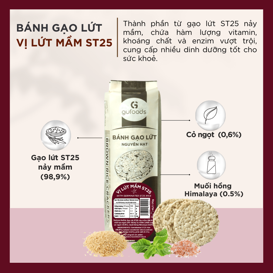 GIỚI THIỆU Bánh gạo lứt vị gạo lứt mầm ST25 GUfoods với thành phần chính từ gạo lứt ST25 nảy mầm, chứa hàm lượng vitamin, khoáng chất và enzim vượt trội, cung cấp nhiều dinh dưỡng tốt cho sức khoẻ. Bánh không đường, không chiên qua dầu, giàu chất xơ, có thể kết hợp cùng nhiều công thức, giúp bữa ăn healthy của bạn thương đa dạng và phong phú. ĐẶC ĐIỂM NỔI BẬT ✓ Gạo lứt mầm chứa hàm lượng dinh dưỡng vượt trội so với gạo lứt thông thường ✓ Giàu lợi ích sức khoẻ từ GABA có trong mầm gạo ✓ Không chiên dầu, không chất bảo quản, lành mạnh cho sức khoẻ ✓ Sản xuất theo công nghệ ép thuỷ lực, giúp giữ lại trọn vẹn dinh dưỡng của gạo lứt mầm ✓ Phù hợp ăn kiêng, eat clean, ăn vặt healthy, thực dưỡng, tập gym, tập thể thao ✓ Bữa ăn nhẹ tiện lợi, tiết kiệm thời gian nấu nướng ✓ Sản phẩm dễ bị vỡ khi vận chuyển xa bằng các kênh vận chuyển thông thường, bạn cân nhắc trước khi đặt nhé ✓ Sản phẩm có thể mất độ giòn theo thời gian, và có mùi dầu do lớp dầu gạo tự nhiên có trong vỏ gạo lứt, có thể khắc phục bằng cách quay trong lò vi sóng hoặc nồi chiên không dầu trong 1-2 phút HƯƠNG VỊ Bánh giòn rụm, xốp thơm vị gạo lứt mầm tự nhiên. THÀNH PHẦN Gạo lứt ST25 nảy mầm (98.9%), chất tạo ngọt (INS 960a) tự nhiên (chiết xuất cỏ ngọt) (0.6%), muối hồng Himalaya (0.5%). GIÁ TRỊ DINH DƯỠNG Trong 100g bánh gạo lứt vị lứt mầm ST25 có: