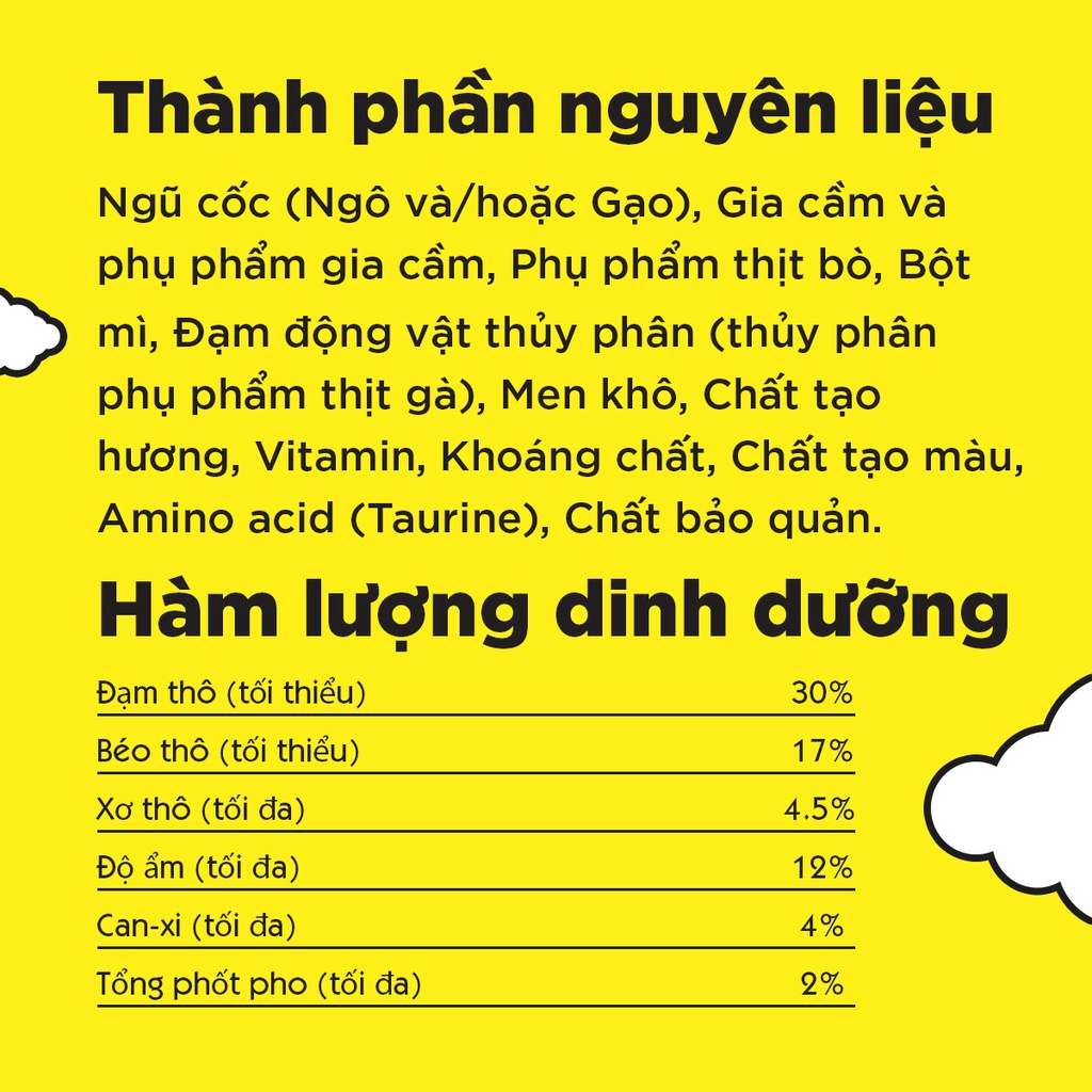 -----------------------------------Giới thiệu sản phẩm------------- -------------------------- Quy cách đóng gói : Thùng 9kg = (6 túi x 1,5 kg) Hương vị: Hải sản Thành phần dinh dưỡng: Công thức: 30%Protein (tối thiểu 10%Chất béo thô (tối