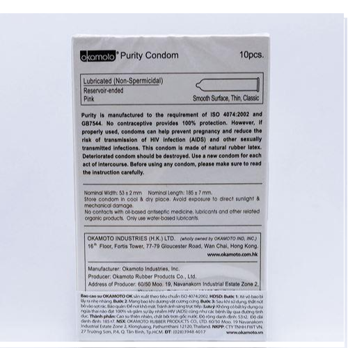 - Sản phẩm không mùi tinh khiết, không sử dụng với các loại khử trùng, chất bôi trơn có gốc dầu hay các sản phẩm hữu cơ có liên quan mà chỉ sử dụng chất bôi trơn gốc nước. Bao cao su okamoto skinless skin purity Bởi bao cao su siêu mỏng khi có độ mỏng chỉ với 0,05mm nên mang lại cảm giác cảm giác chân thực và trải ngiệm thú vị cho các cặp đôi. Đặc biệt hơn khi sản phẩm bao cao su này không có mùi và rất tinh khiết, không có mùi cao su gây khó chịu như các loại bao cao su thông thường. Thông tin chi tiết sản phẩm Bao Cao Su Nhật Okamoto - Siêu Mỏng - Không Mùi - Skin Purity - Chính hãng