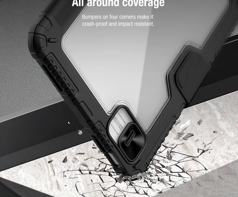 Bao da chống sốc cho iPad Gen 10 hiệu Nillkin Bumber Pro có ngăn đựng bút Với thiết kế chống sốc, bao phủ toàn bộ các cạnh chông sóc bao quanh khung viền máy cho khả năng bảo vệ lên mức cao, giữ nguyên tỉ lệ 1:1 các nút bấm của máy.