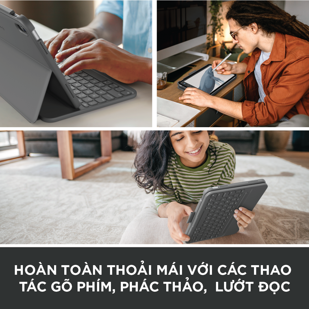 Chiếc Bao da kèm bàn phím Slim Folio của Logitech cho phép bạn trải nghiệm việc gõ thoải mái trên iPad (thế hệ thứ 10 - iPad Gen 10) dù đi bất cứ đâu. Bao da này có thiết kế nhỏ và sáng màu, khiến cho việc mang nó đi khắp nơi trở nên dễ dàng hơn, trong khi vẫn giữ cho iPad của bạn được an toàn khỏi bị va đập và trầy xước. Slim Folio còn khóa iPad của bạn ở góc độ tối ưu để gõ hay phác thảo, đồng thời giữ chắc chắn trên mọi bề mặt.
