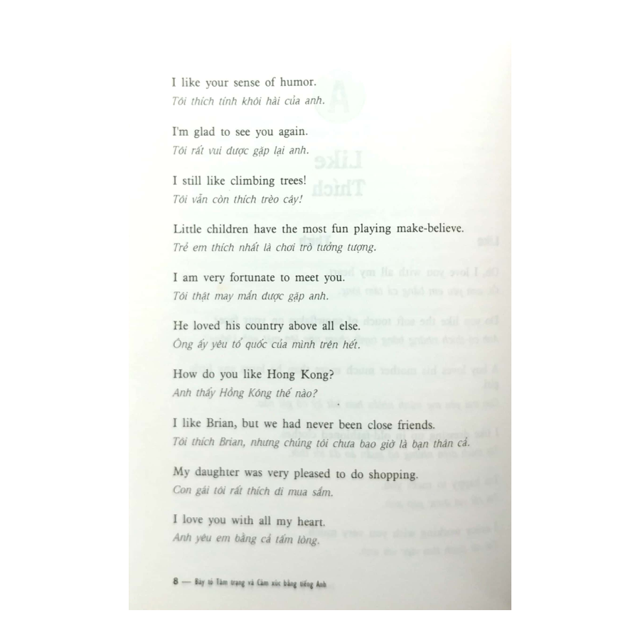 Mua tại TiktokCuốn sách này gồm những câu tiếng Anh dùng trong các tình huống bày tỏ tâm trạng và cảm xúc: thích, tán thành, đồng ý, ca ngợi, thừa nhận, tức giận, than phiền, tranh cãi, ghét, buồn chán, bực tức.