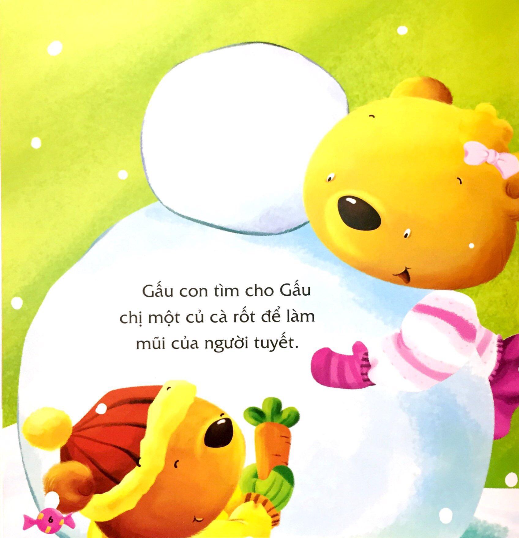 Gấu chị muốn đắp một người tuyết thật to. Nó liền bắt tay ngay vào làm thật nhanh, chẳng mấy chốc thân mình, hai vai… người tuyết đã xong rồi. Gấu con chạy ngay đi tìm củ cà rốt để làm mũi, hai cái cúc làm mắt cho người tuyết, nhờ đó mà người tuyết đáng yêu đã được hoàn thành rồi. Gấu chị liền cảm ơn cô em gái tốt bụng. Hai chị em gấu cùng cười vui vẻ.