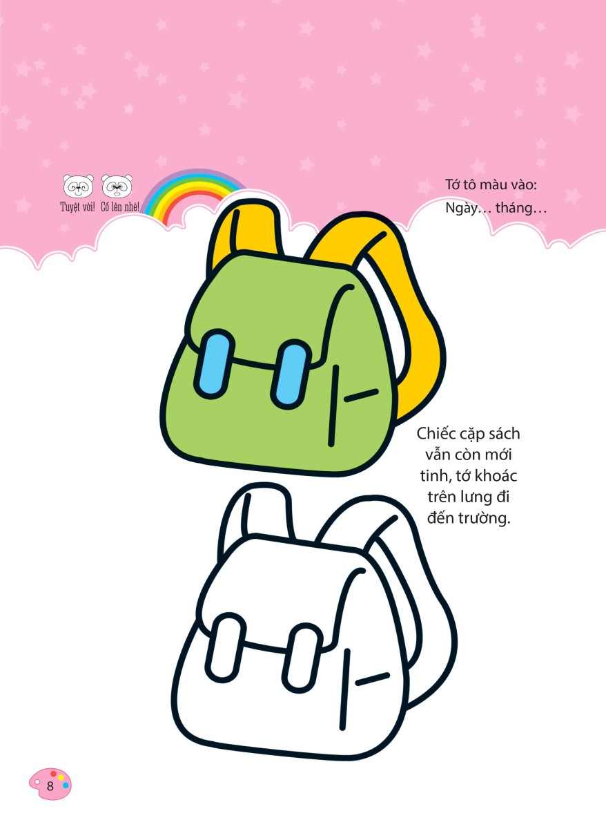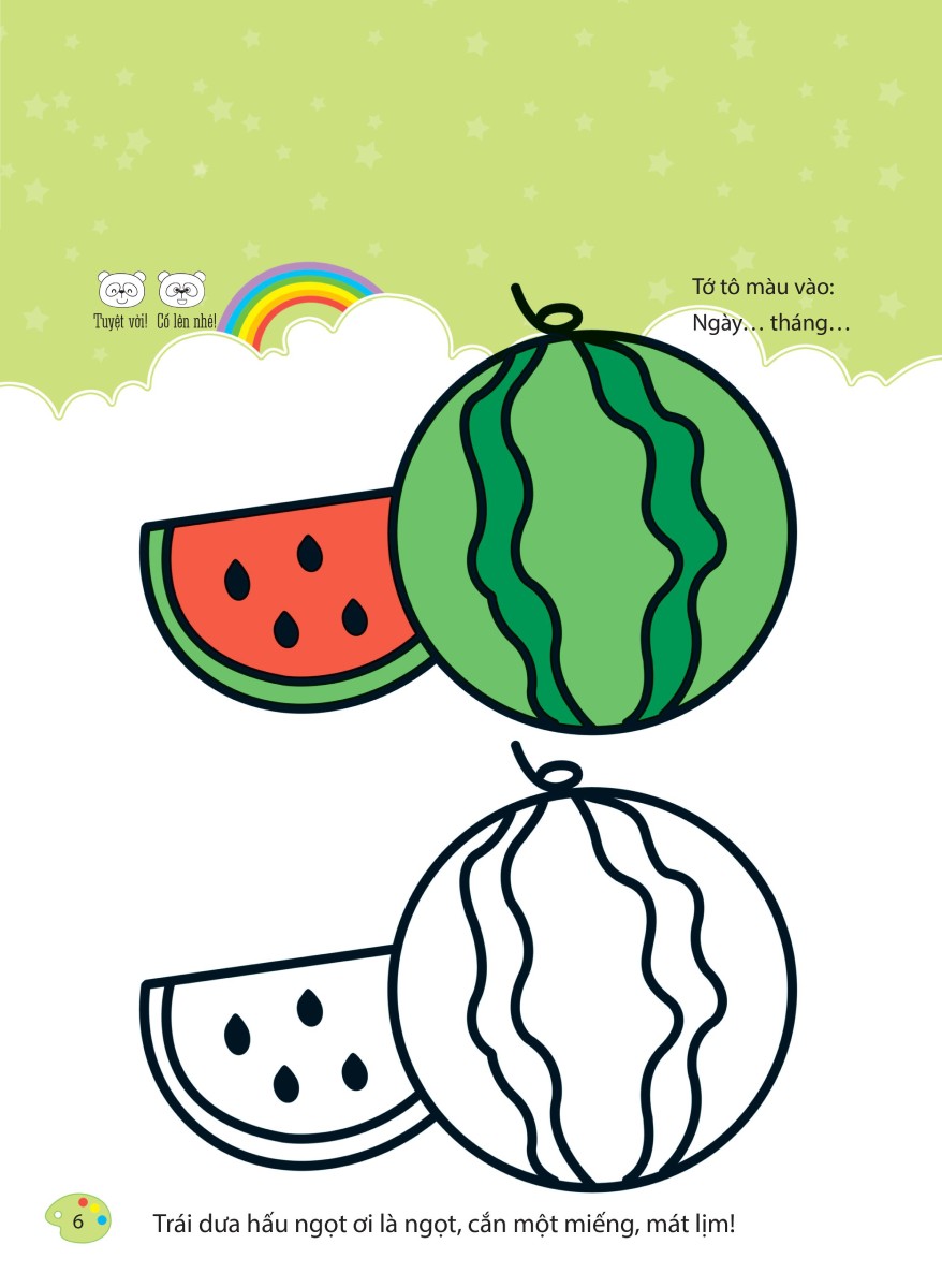 Ngoài việc tô màu theo sự sáng tạo riêng của mỗi bé, sách có gợi ý màu sắc, hình tô mẫu để các bé có thể dễ tưởng tượng và ghi nhớ được hình dạng và màu sắc.