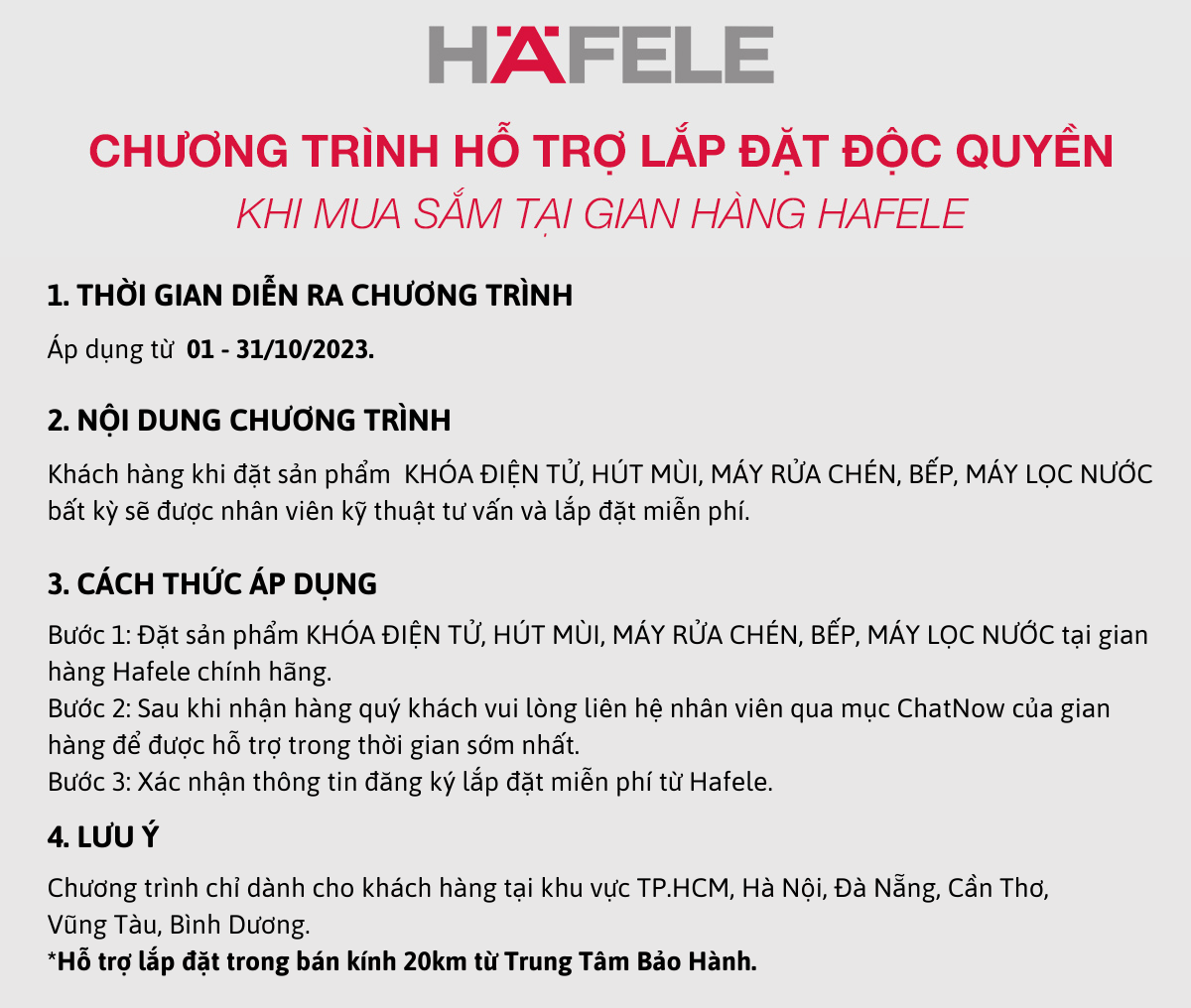 Note: Chương trình chỉ dành cho khách hàng tại khu vực TPHCM, Hà Nội, Đà Nẵng, Cần Thơ, Vũng Tàu, Bình Dương. Hỗ trợ tận nơi trong bán kính 20km (tính từ trạm bảo hành HAFELE đến địa chỉ lắp đặt của khách hàng). Xem danh sách trạm bảo hành tại Website của Hafele.