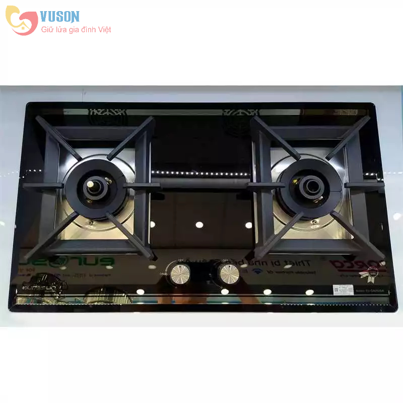 Bếp 02 lò: 01 lò to, 01 lò nhỏ Mâm chia lửa bằng đồng Hệ thống đánh lửa pin Pép hầm tiết kiệm gas Mặt kính cường lực, màu đen Kiềng gang đúc Lượng gas