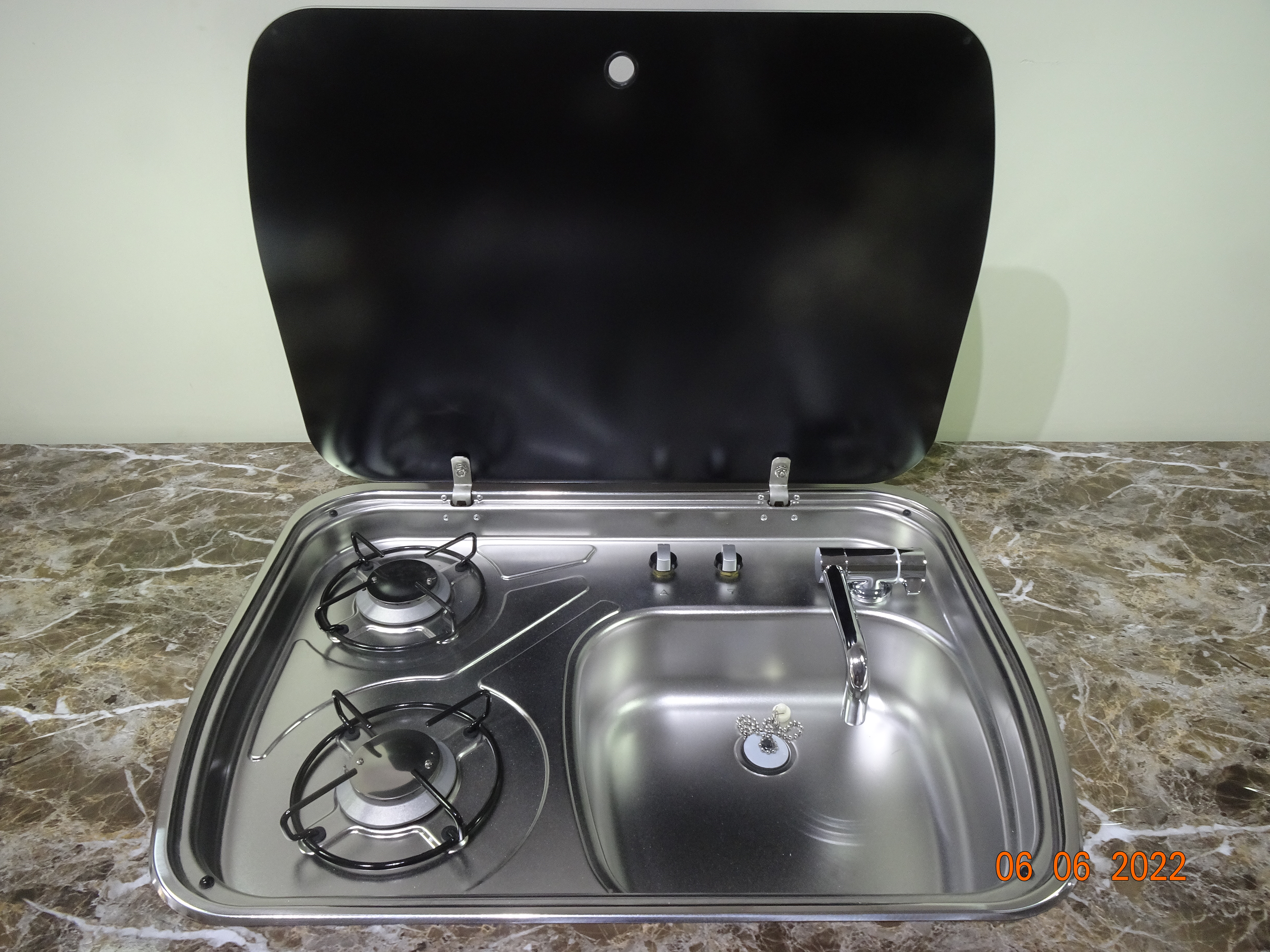 Tích hợp chung với bếp ga đôi là một chậu rửa chén nhỏ gọn chứa được 12 lít nước. Tuyệt vời khi toàn bộ bếp và chậu rửa chỉ chiếm mặt bằng 0,48 x 0,37m