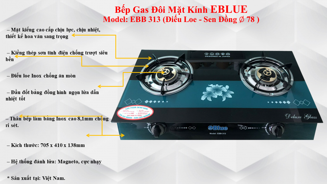 ✨Bếp Gas Đôi Mặt Kính eBlue - (Sen Đồng) EBB313- Hàng Chính Hãng