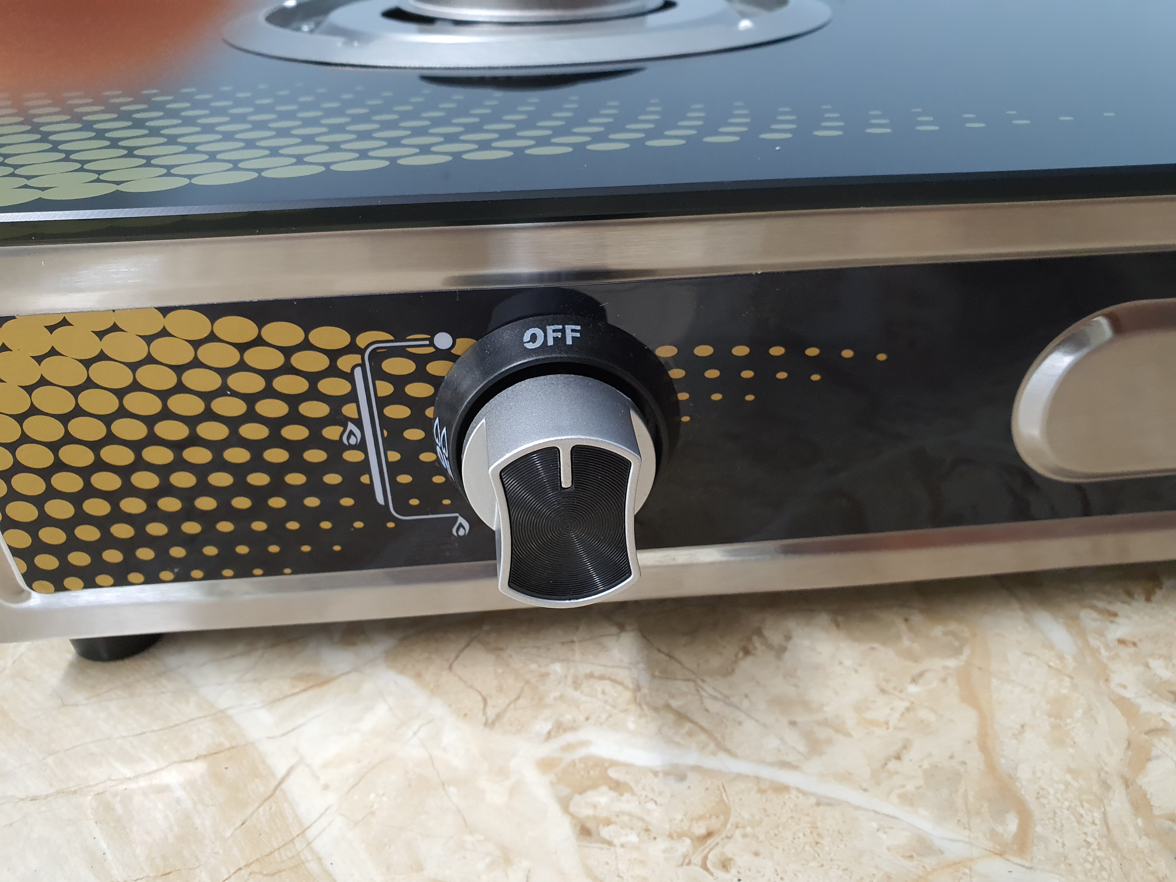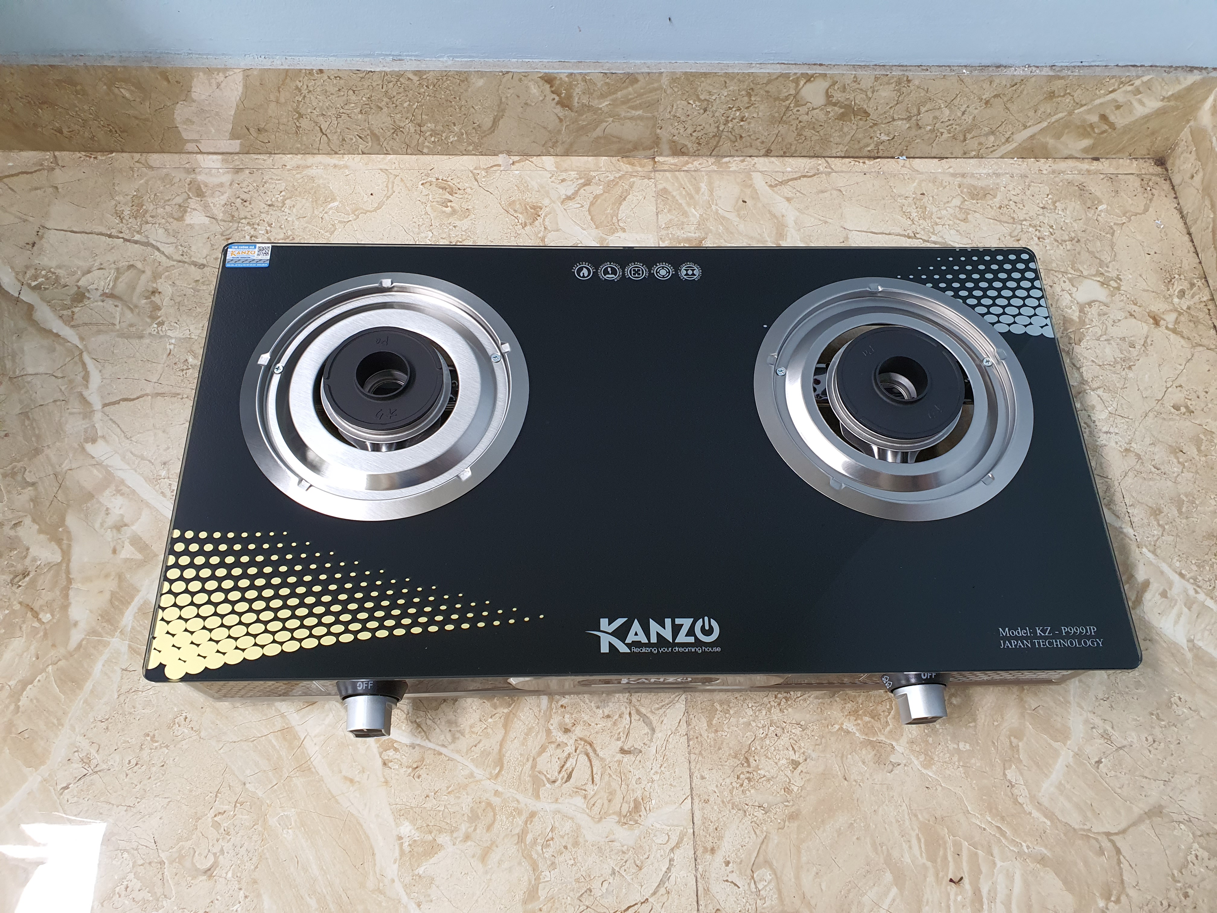 Bếp gas dương kính  KANZO KZ-P999JP có 2 lò đun, điều khiển lửa to nhỏ bằng núm vặn tiện lợi, chế biến được nhiều món ăn cùng lúc. Mặt kính với gam màu đen phối vàng tươi mới, vừa mang lại tính thẩm mỹ cao vừa có khả năng chịu lực, chịu nhiệt, đồng thời dễ dàng vệ sinh sau khi sử dụng.