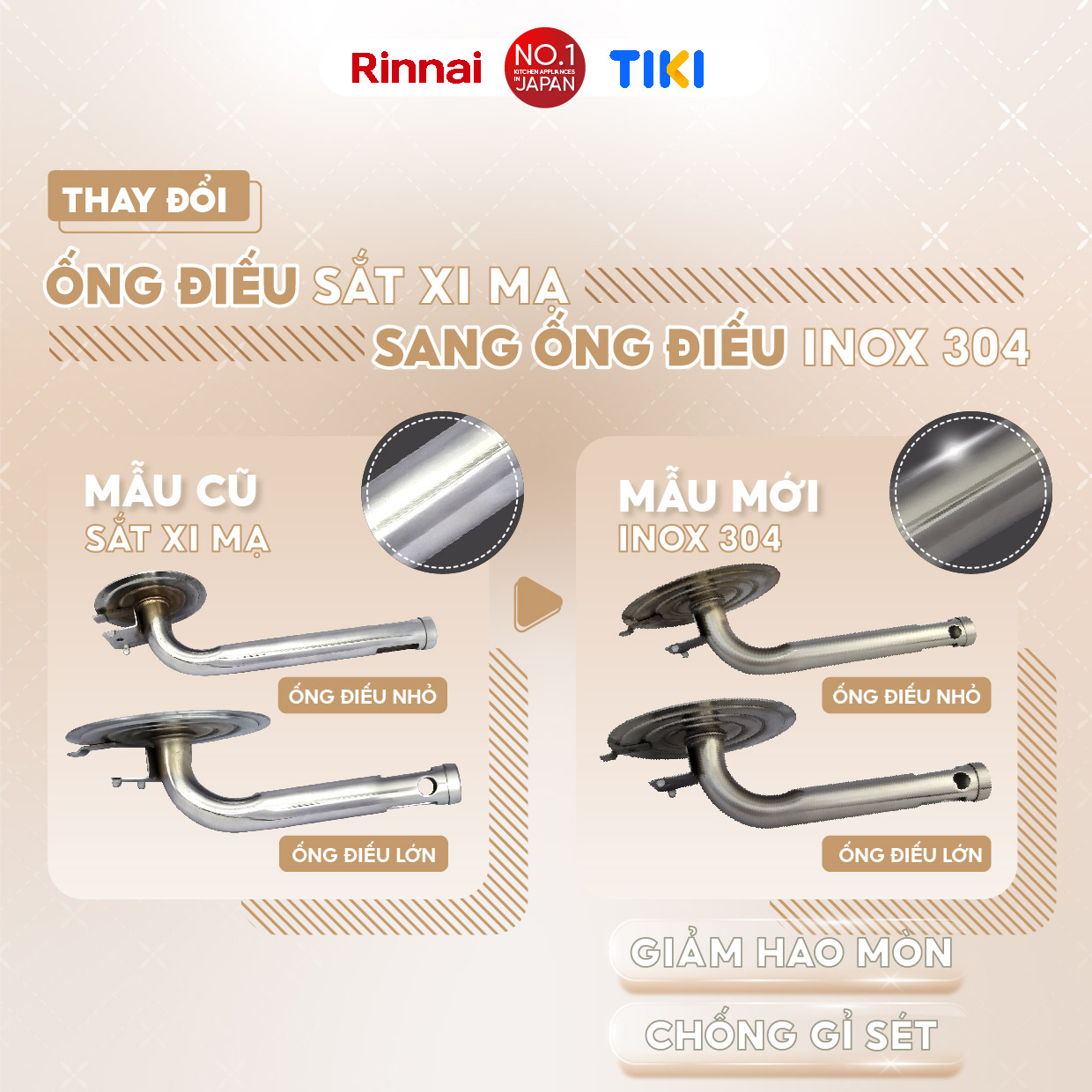 * Mặt kiếng cao cấp chịu lực, chịu nhiệt, thiết kế hoa văn sang trọng; - Thân bếp làm bằng inox chống rỉ sét, cao 60mm; - Núm vặn kiểu Rinnai; - Kiềng thép sơn