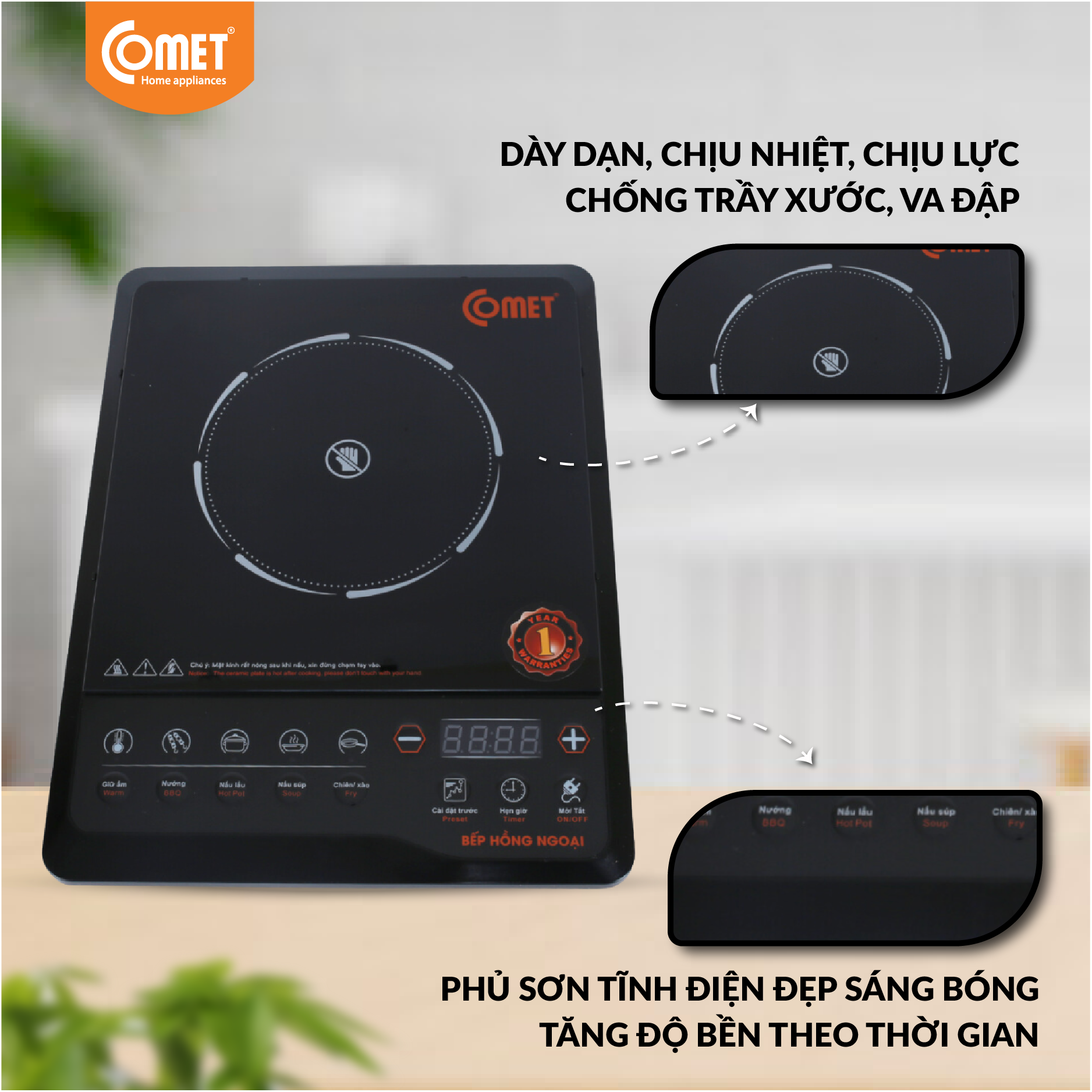 ƯU ĐIỂM NỔI BẬT - Bếp hồng ngoại Comet CM5558 có thiết kế và màu sắc ưa nhìn, nhiều chức năng nấu tiện lợi và tiết kiệm điện năng. - Mặt bếp trang bị kính
