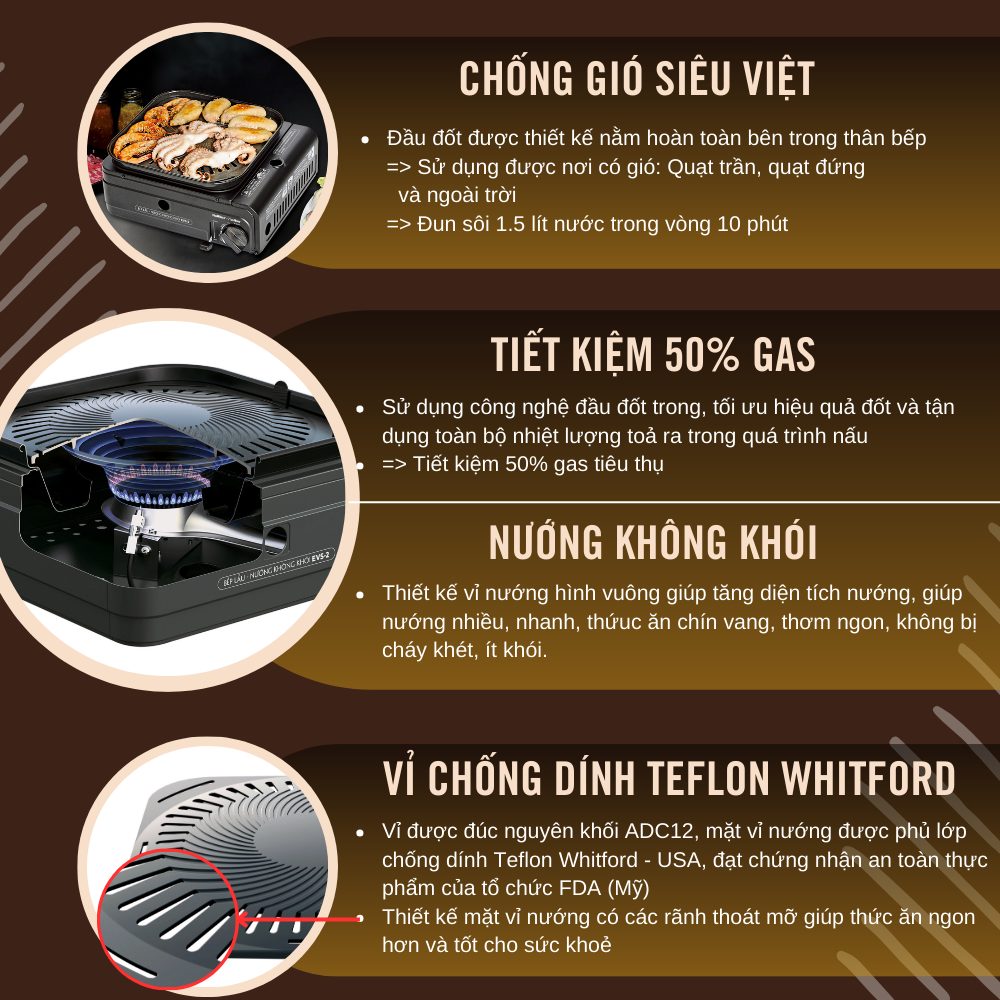 Đặc điểm nổi bật Bếp nướng không khói. Đại tiệc BBQ ngay tại nhà. Thiết kế khay nướng rộng, có rãnh, kiểu dáng đẹp mắt. Nhiều mức chỉnh nhiệt phù hợp cho từng món ăn. Nướng