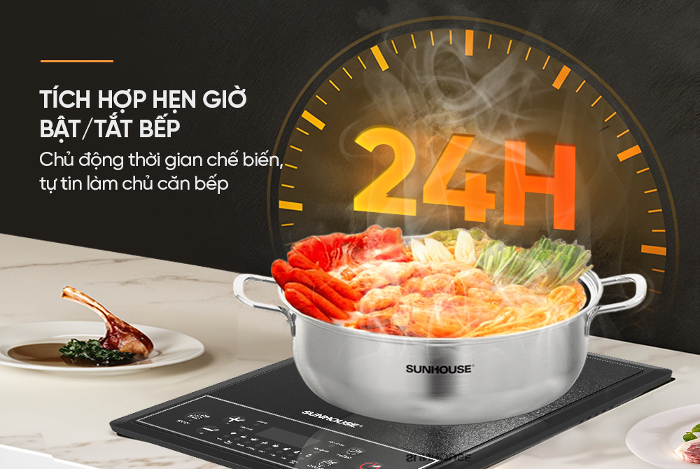 Nhờ chức năng hẹn giờ linh hoạt, bạn có thể chủ động lên kế hoạch nấu nướng mà không cần canh chừng liên tục. Với các món như lẩu, chiên, xào, nướng, bạn có thể tự điều chỉnh nhiệt độ theo ý muốn trong quá trình nấu, đồng thời hẹn giờ lên tới 24 tiếng – cực kỳ tiện lợi cho những bữa tiệc hay chuẩn bị nguyên liệu trước.