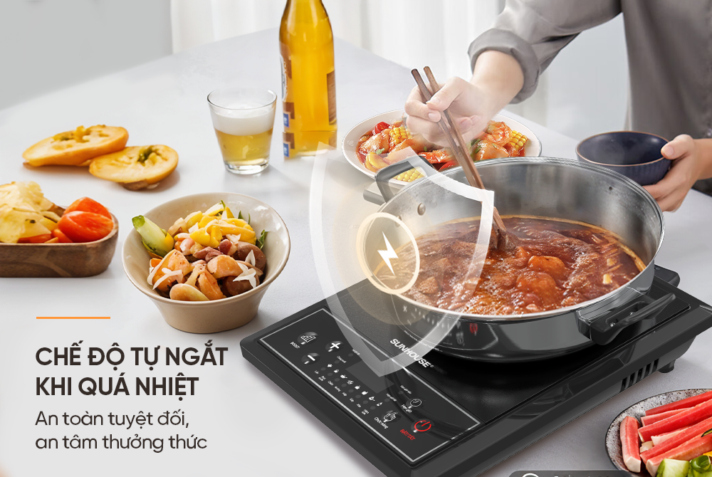 Bên cạnh đó, Bếp từ đơn Sunhouse SHD6154 cũng sẽ tự động dừng hoạt động trong trường hợp dòng điện vượt quá mức cho phép, bếp đạt đến nhiệt độ tối đa.