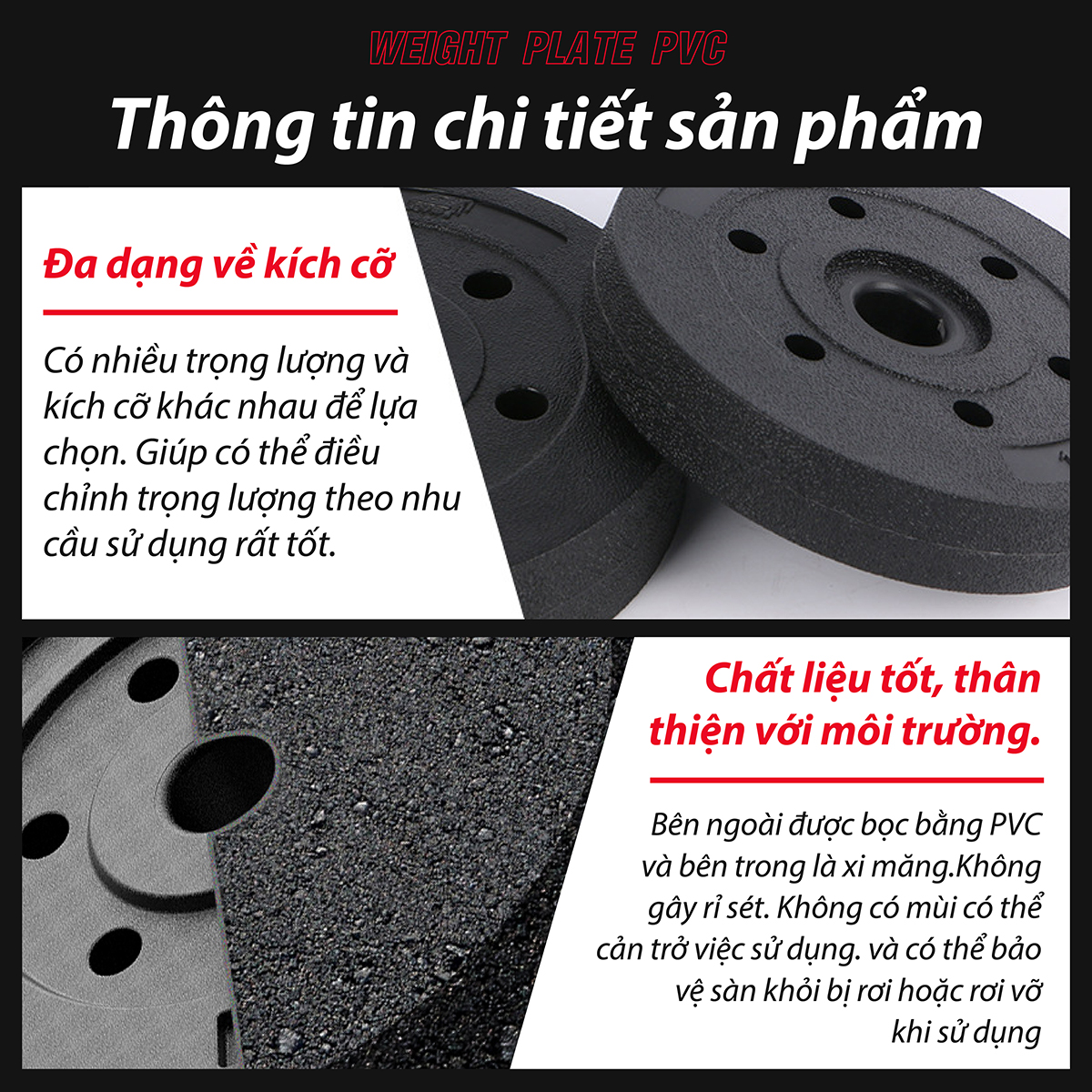 - Tạ miếng nhựa có vỏ ngoài là nhựa cứng cao cấp, ruột gồm cát và xi măng.