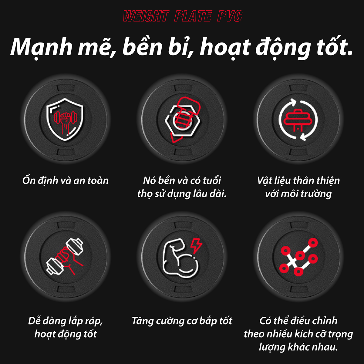 - Trên mỗi miếng tạ có ghi rõ trọng lượng tạ, giúp người tập không bị nhầm lẫn khi chọn tạ để tập. Công dụng sản phẩm: