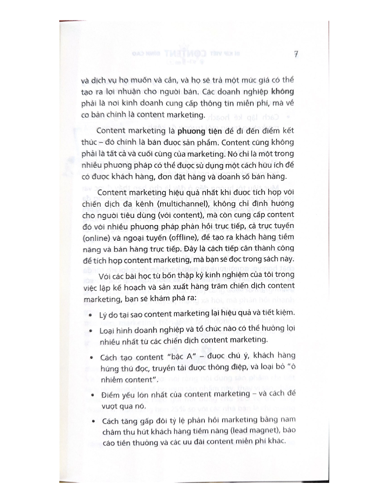 Bí Kíp Viết Content Đỉnh Cao giúp các doanh nhân, marketer và chủ doanh nghiệp nhỏ hiểu được vai trò thực sự của content trong các chiến dịch marketing đa kênh tích hợp, tránh lãng phí thời gian và tiền bạc bằng cách cứ tạo content mà không có tỷ suất hoàn vốn (ROI). Thay vào đó, sách hướng dẫn cách tạo và cung cấp nội dung để xây dựng lòng tin, kích thích sự quan tâm của khách hàng, và chạm đến mục đích cuối cùng của việc kinh doanh là bán hàng.