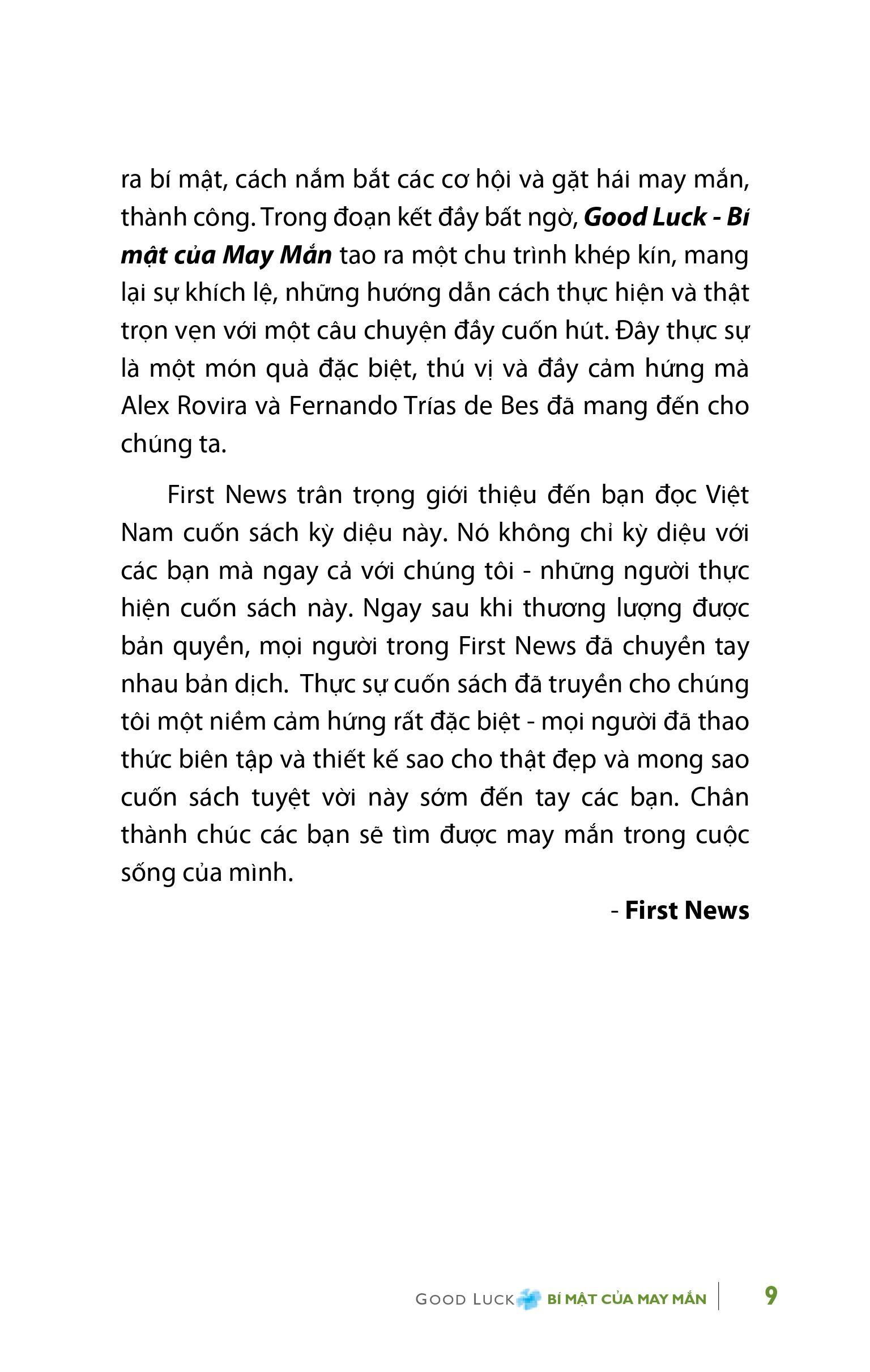 Nghiên cứu cuộc sống dưới góc nhìn của tâm lý học Alex Rovira và Fernando Trías de Bes đã phát hiện được “dấu chân của thần may mắn” mà ai cũng có thể tìm gặp. Cuốn sách của hai ông Good Luck – Bí mật của may mắn là tập hợp những câu chuyện lạ thường hướng đến một bài học vô cùng giá trị về cuộc sống: Sự may mắn không xuất hiện ngẫu nhiên trong hành trình cuộc sống chúng ta; chính chúng ta phải tìm và tạo ra những điều kiện để may mắn tìm đến với mình.
