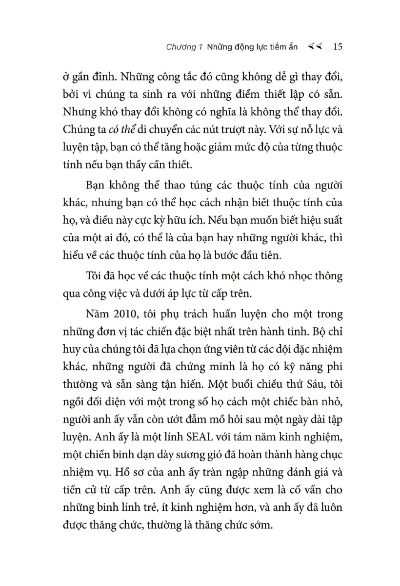 Bí Mật Đằng Sau Những Cá Nhân Xuất Sắc Điều gì sẽ giúp bạn đưa ra quyết định đúng đắn khi rơi nghịch cảnh? Theo tác giả Rich Diviney viết trong quyển sách “Bí Mật Đằng Sau Những Cá Nhân Xuất Sắc”, các “thuộc tính” ẩn bên trong, luôn chạy ở chế độ ngầm và quyết định cách chúng ta cư xử, phản ứng, đưa ra quyết định hay hành động. Tác giả Rich Diviney là Trung tá của Hải quân SEAL - lực lượng được mệnh danh là tinh nhuệ nhất quân đội Mỹ, chính là lực lượng đã tiêu diệt trùm khủng bố Bin Laden. Diviney là một trong những người chịu trách nhiệm đào tạo, tuyển chọn lính SEAL cho một đội đặc nhiệm thuộc Hải quân SEAL. Điều mà Diviney và các đồng đội của ông tìm kiếm không phải là kỹ năng, mà chính là các “thuộc tính”. Thuộc tính chỉ bộc lộ khi bạn gặp những tình huống có tính thử thách cao, đặc biệt là ở những hoàn cảnh bất định buộc bạn phải hành động theo bản năng. Các thuộc tính cũng ảnh hưởng đến cách mọi người, bao gồm đội nhóm, cấp trên cấp dưới, vợ chồng, con cái và bạn bè tương tác với nhau. Một nhóm đồng nghiệp có năng lực, có kỹ năng nhưng khi làm việc cùng nhau có thể là một thảm họa, trong khi một tập hợp những cá nhân dường như chỉ ở mức trung bình lại là một tập thể xuất sắc. Các thuộc tính có thể gợi ý ai là người lãnh đạo hiệu quả và ai là cấp dưới trung thành. Không nên nhầm lẫn thuộc tính với các đặc điểm tính cách. Tính cách được xây dựng từ các khuôn mẫu hành vi tồn tại trong một khoảng thời gian dài. Đó là biểu hiện bên ngoài của tất cả những điều tạo nên con người bạn: kỹ năng, thói quen, cảm xúc, quan điểm và thuộc tính của bạn, tất cả điều này kết hợp với nhau. Có vô số yếu tố ảnh hưởng đến tính cách của bạn, từ di truyền, cách nuôi dạy đến môi trường sống. Thuộc tính chỉ là một trong những yếu tố cơ bản đó. Bí Mật Đằng Sau Những Cá Nhân Xuất Sắc định nghĩa “THUỘC TÍNH” là những gì? Theo định nghĩa của Rich Diviney, thuộc tính là: