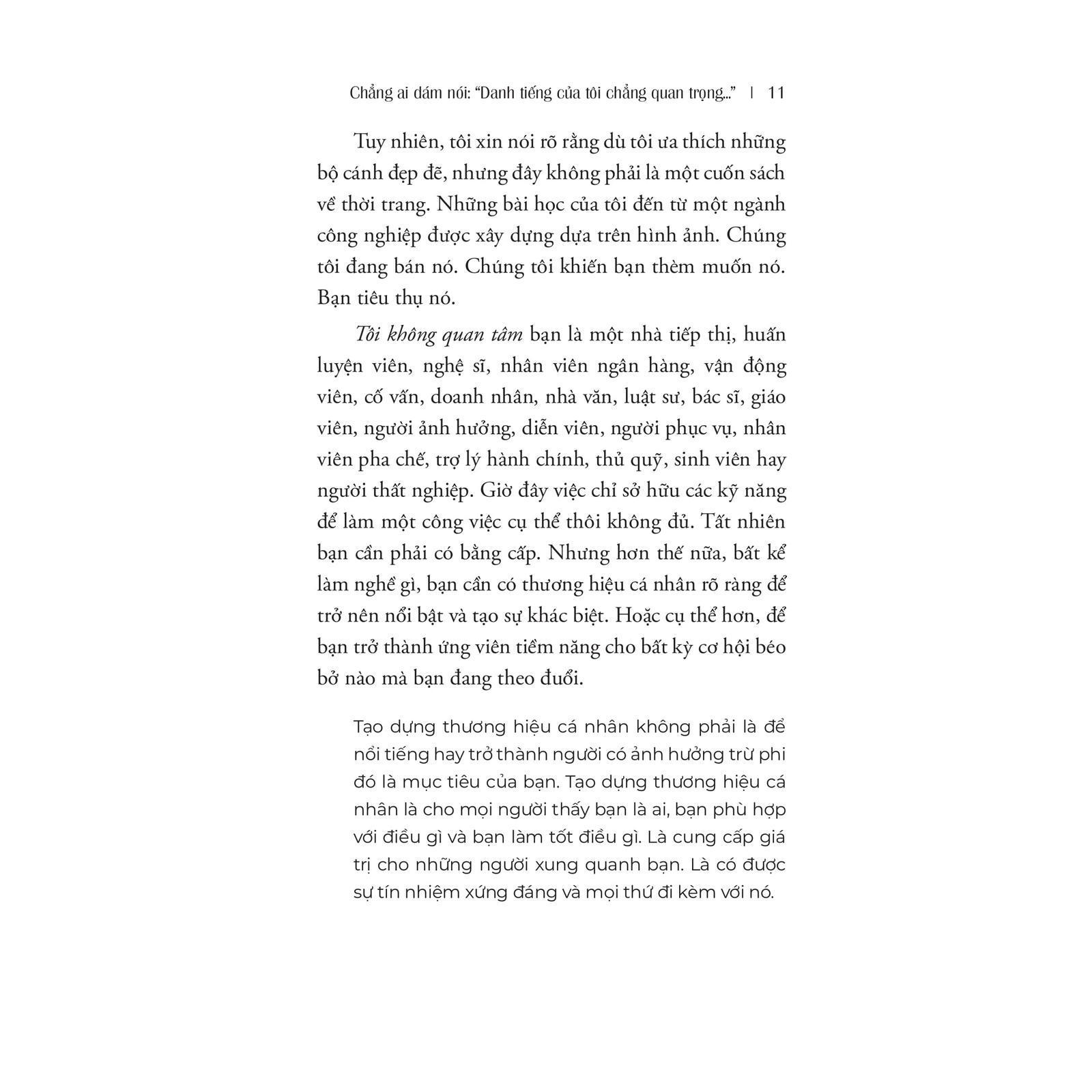 Vào thời điểm đọc cuốn sách này, trên cương vị là nhà sáng lập Pencil Group (pencil), người cũng đang trong hành trình không ngừng nỗ lực xây dựng một công ty, một thương hiệu cá nhân gắn liền với triết lý sáng tạo, đổi mới, cam kết phục vụ cộng đồng, tôi nhận rằng để tạo dựng niềm tin và sự ảnh hưởng, bạn cần vượt qua ranh giới của chức danh công việc, và bước vào hành trình định thân. Và với tất cả những điều đó, cuốn sách này sẽ không chỉ là kim chỉ nam trong việc xây dựng thương hiệu cá nhân, hơn thế nó còn là nguồn cảm hứng để bạn khám phá tiềm năng của bản thân và dũng cảm bước ra khỏi vùng an toàn.