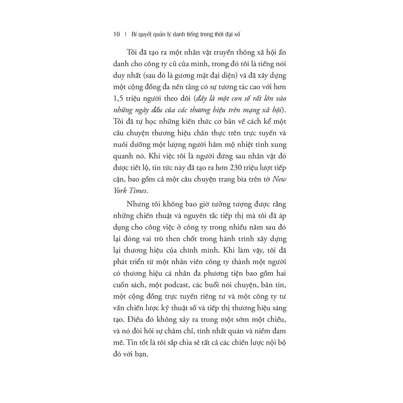 Có thể coi Bí quyết quản lý danh tiếng trong thời đại số là cuốn cẩm nang hướng dẫn độc giả xác định câu chuyện thương hiệu của riêng mình dựa trên kinh nghiệm, đam mê và mục tiêu nghề nghiệp.