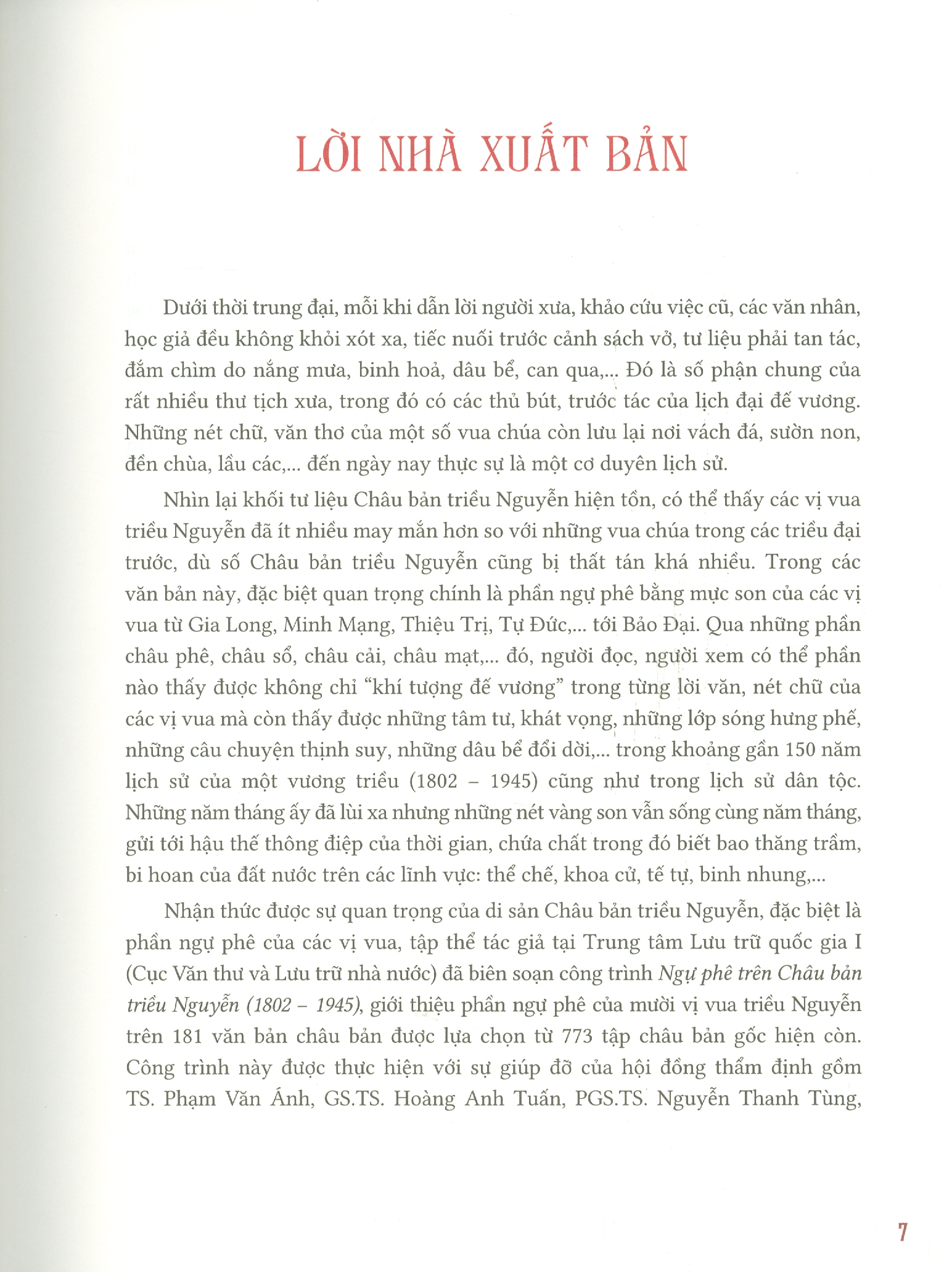 – Phần thứ nhất, giới thiệu khái lược về Châu bản và cách phê duyệt văn bản của các vua triều Nguyễn.
