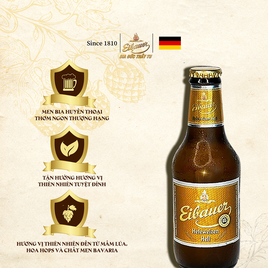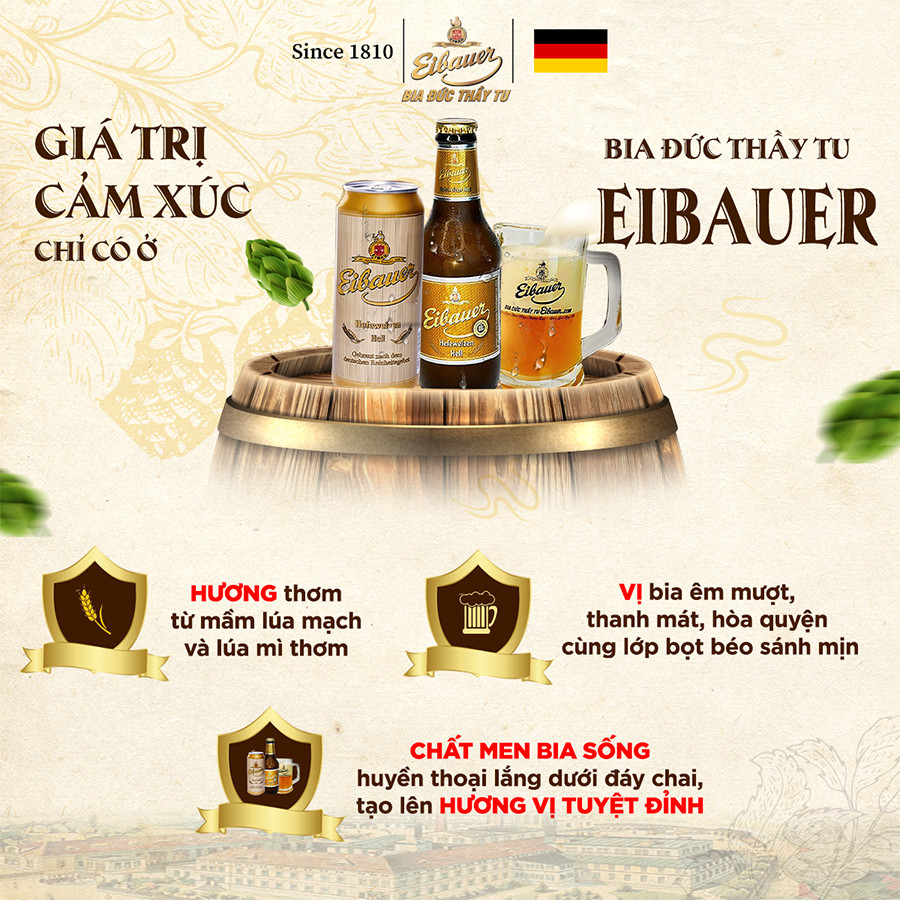 Đây chính là giá trị thực mà hơn 200 năm qua Bia Thầy tu Eibauer luôn hướng đến. Bia thầy tu vàng Eibauer có thành phần chủ yếu là mầm lúa mạch. Chỉ vài hớp cảm xúc rạo rực hơn rất nhiều. Đi làm căng thẳng mệt mỏi... chỉ với 1 lon bia, cảm giác vui vẻ hưng phấn lại dạt dào, năng lượng tích cực lại tràn trề. Thức dậy sảng khoái, đầu óc nhẹ nhàng, cơ thể mạnh mẽ - một thứ hương vị của cảm xúc đầy lịch lãm và tinh tế.