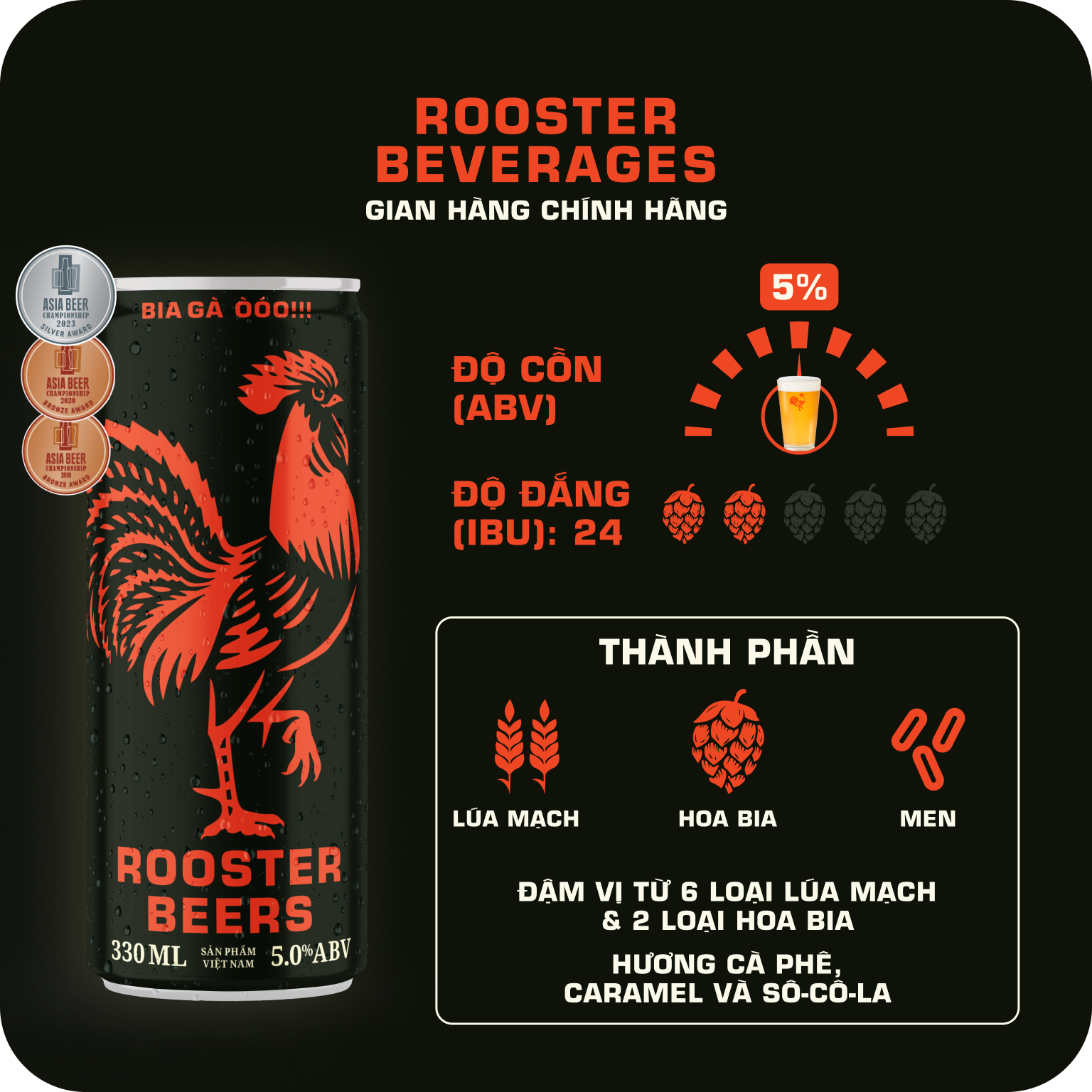 Rooster Beers Dark - Vị Êm Đằm Dòng bia đen được yêu thích nhất Sài Gòn. Bia được nấu theo phong cách Mexico & Đức đem đến cho người uống những trải nghiệm tuyệt vời. Mỗi ngụm bia mát lạnh mang đến cho người thưởng thức vị bia êm đằm tinh tế, quyện cùng hương cà phê, ca-ra-men và sô-cô-la đậm đà. Rooster Dark là lựa chọn tuyệt vời trong tiết trời oi ả. Ghi chú • Bia Ale đen phong cách Mexico • Được nấu từ 6 loại lúa mạch và 2 loại hoa bia • Vị êm đằm. Đậm hương cà phê, caramel và sô-cô-la. • 5.0% ABV – 24 IBU • Dùng kém thịt đỏ, món cay, món nướng BBQ. Mô tả sản phẩm sản phẩm Rooster Beers Dark (Bia Gà): • Xuất xứ: Việt Nam • Quy cách: lon sleek 330ml • Bao bì sản phẩm có thể thay đổi tùy theo thời điểm và nhà cung cấp VỀ ROOSTER BEERS: Là những chuyên gia nấu bia đầy đam mê, sáng tạo và nhiệt huyết, chúng tôi mong muốn mang đến cho khách hàng những dòng bia thủ công mang hương vị cổ điển tuyệt hảo. Mỗi ngụm bia Rooster mát lạnh sẽ là một trải nghiệm thuởng thức đáng nhớ, kể cả đối với những người sành bia lâu năm.