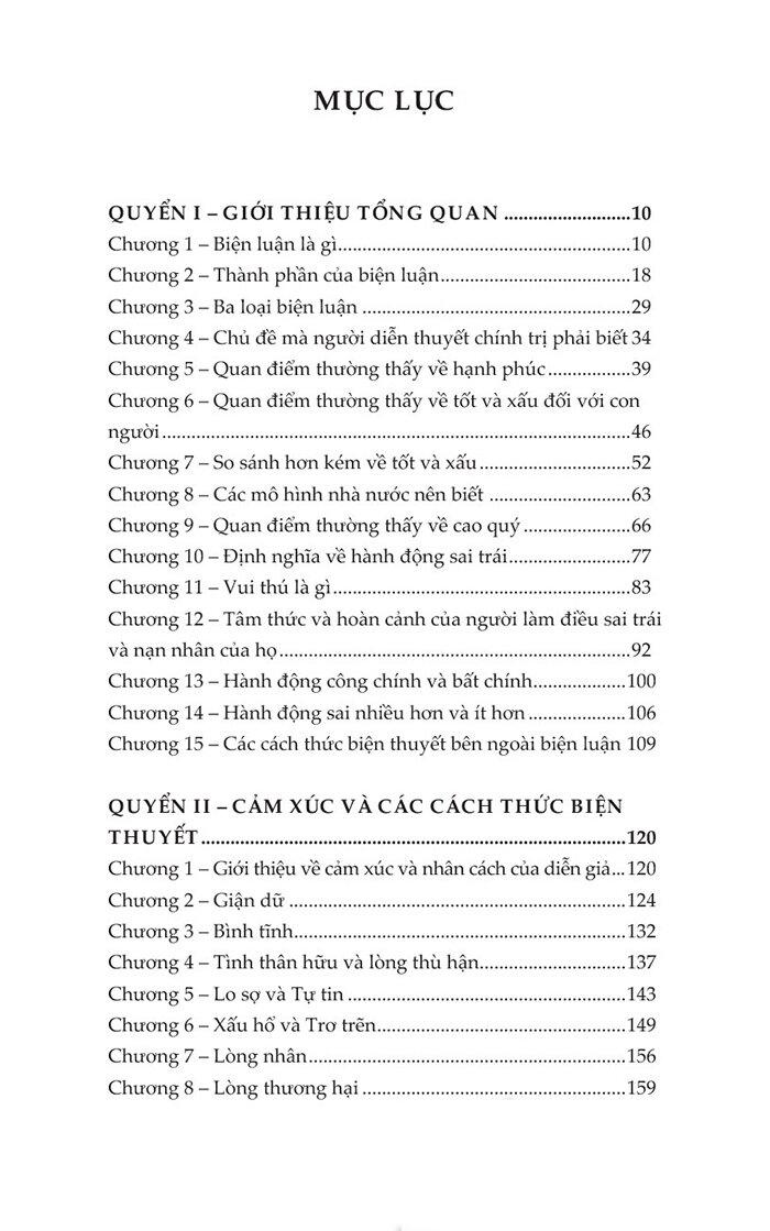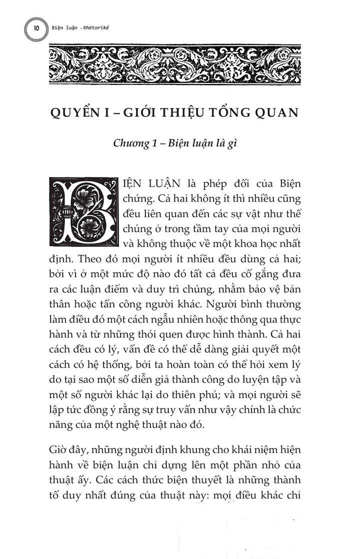 Biện Luận - Rhētorikḗ - Tác Phẩm Triết Học Kinh Điển Trước nay, chúng ta thường nhầm lẫn giữa “biện luận”, “hùng biện” và “diễn thuyết”… từ đó dẫn đến sự phân tích và đánh giá sai tính khả tín của các diễn ngôn và văn bản. Mặc dù “Biện Luận” của Aristotle là một tác phẩm quan trọng trong phương pháp tư duy và biểu đạt, nhưng sự nhầm lẫn giữa “biện luận” và “hùng biện” hay “diễn thuyết” đã khiến tác phẩm bị hiểu theo chiều hướng thuyết phục niềm tin của người nghe. Trên thực tế “Biện Luận” của Aristotle là một công cụ tư duy để truy vấn các luận điểm và biểu đạt thực tại thông qua ngôn ngữ. “Biện Luận” cần thiết cho bất cứ ai hoạt động trong ngành khoa học thông tin, báo chí, truyền thông, nghiên cứu, pháp luật. Và mỗi sinh viên, dù ở ngành học hay cấp bậc nào, cũng cần biết cách “Biện Luận” để thực hiện các tiểu luận, luận văn, luận án nghiên cứu có giá trị. Cuốn sách đặc biệt hữu ích trang bị công cụ tư duy cho những ai không muốn bị thao túng tâm lý bởi các thuật ngụy biện thường thấy. Cái đúng và cái gần đúng được nhận dạng theo cùng một cách, có thể hiểu là mọi người đều có một đặc tính bẩm sinh đầy đủ để hiểu đâu là đúng, và thường hướng đến chân lý. Bởi vậy hễ ai phán đoán đúng về sự thật thì cũng có thể phán đoán đúng về tính không chắc chắn. Quyển I, chương 1 Biện luận hiệu quả bởi vạn sự đều đúng và chúng luôn có một chiều hướng tự nhiên để thắng thế trước cái đối lập của m.ình, cho nên nếu phán quyết của các thẩm phán không hợp lẽ thì việc thành bại lại nằm trong tay các nhà diễn thuyết và theo đó họ phải bị định tội. Hơn nữa, trước khi khán giả nào đó thậm chí còn chưa bị ám ảnh với tri kiến chính xác nhất thì cũng sẽ tùy tiện với những gì chúng ta nói để đưa ra lời buộc tội. Với các luận điểm dựa trên tri kiến ẩn chứa sự chỉ dẫn, vẫn có những người mà không ai có thể chỉ dẫn. Do đó, tại đây, chúng ta phải dùng các ý niệm mà ai cũng hiểu như thể đó là lối biện thuyết và lập luận của m.ình khi trình bày các Chủ đề trong thương thảo để luận giải trước công chúng. Quyển I, chương 1 Như ta thấy, mỗi phần chính trong một bài diễn thuyết phải có mục đích rõ ràng. Xét mỗi trường hợp, chúng ta đã ghi chú và chấp nhận những quan điểm và đề xuất mà dựa vào đó ta có thể hình thành lên lập luận của m.ình - với chính trị, với tưởng thưởng, với cả diễn thuyết pháp lý. Chúng ta hơn nữa đã quyết định những phương tiện nào của tính cách đạo đức cần có để đầu tư vào bài nói. Bây giờ chúng ta tiến hành thảo luận các luận điểm chung cho tất cả các bài diễn thuyết. Tất cả các nhà diễn thuyết, bên cạnh khả năng lập luận chuyên biệt, thì cũng rất tiết chế khi sử dụng đề tài Khả thi và Bất khả, ví dụ; và cố gắng chỉ ra rằng một điều có thể xảy ra, hoặc sẽ xảy ra trong tương lai. Quyển II, chương 18