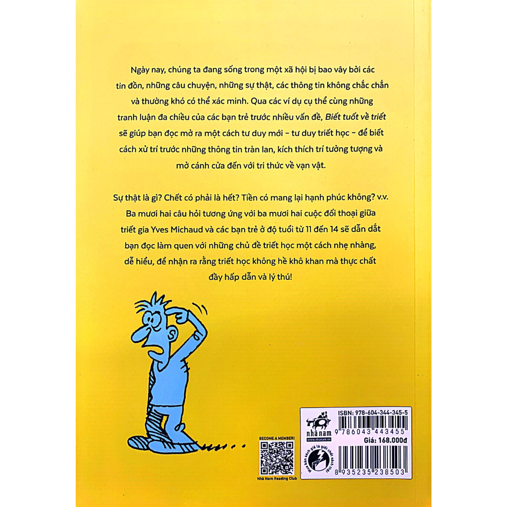 Ta có thể thay đổi thế giới không? Tại sao có chiến tranh? Tiền có mang lại hạnh phúc không? Có lẽ ai trong chúng ta cũng có lúc đặt ra những câu hỏi này, việc suy nghĩ tìm đáp án chính là bạn đang từng chút bước chân vào lĩnh vực tư duy triết học đấy. Để giúp các bạn trẻ đi sâu hơn, triết gia Yves Michaud đã có những buổi thảo luận triết học với một nhóm thanh thiếu niên, được ghi chép và tổng hợp trong cuốn sách này.