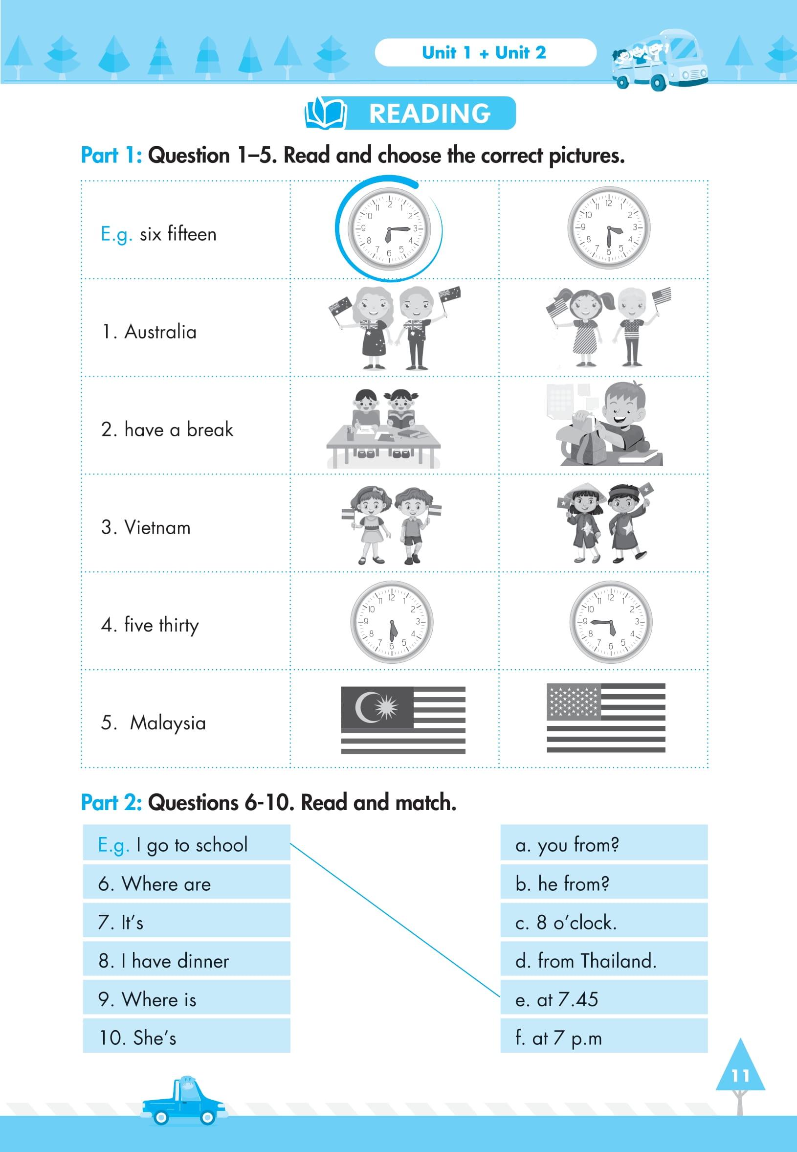 Cứ hai bài sẽ có 2 bài kiểm tra, tất cả các bài kiểm tra đều được thiết kế theo quy định thông tư mới nhất về kiểm tra môn Tiếng Anh tiểu học.