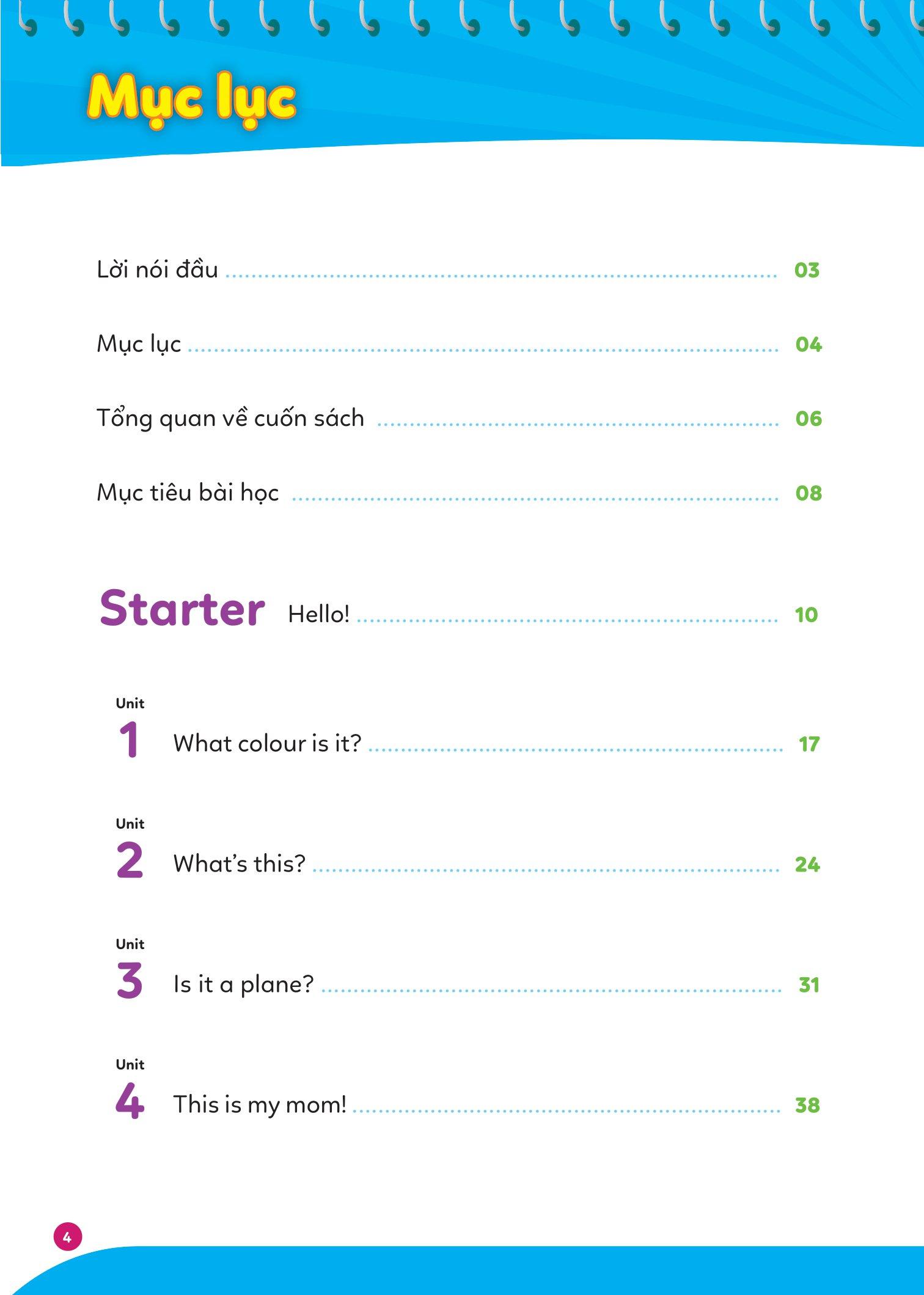 Mỗi cuốn gồm 9 đến 12 chủ đề thân thuộc với các em. Lồng ghép trong mỗi chủ đề chính là các kiến thức và bài tập tiếng Anh, mỗi bài học gồm các phần: