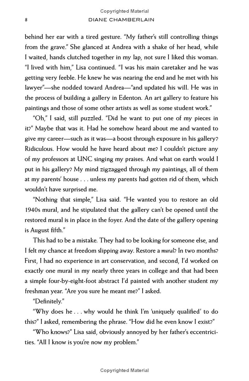 Anna Dale, an artist from New Jersey, wins a national contest to paint a mural for the post office in Edenton, North Carolina. Alone in the world and in great need of work, she accepts. But what she doesn't expect is to find herself immersed in a town where prejudices run deep, where people are hiding secrets behind closed doors, and where the price of being different might just end in murder.