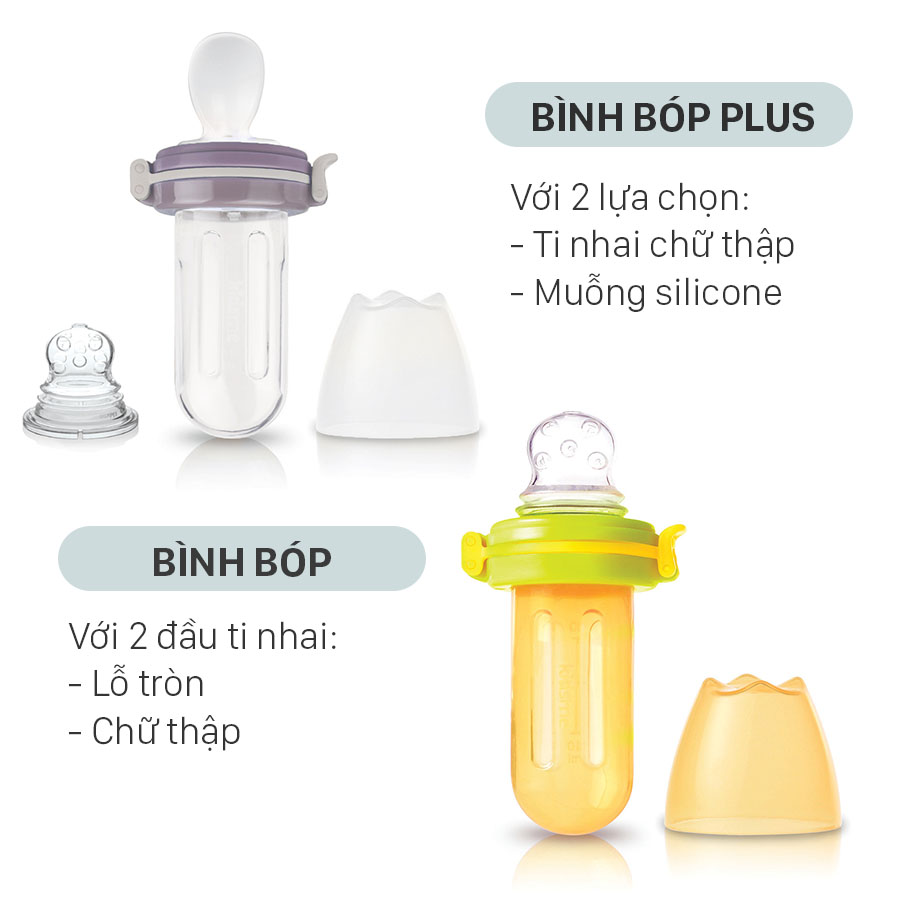 - Bình bóp có 2 loại: 1 loại thường (dành cho ăn dặm cháo bột) và 1 loại Plus (dành cho chống hóc) có thêm muỗng silicone.