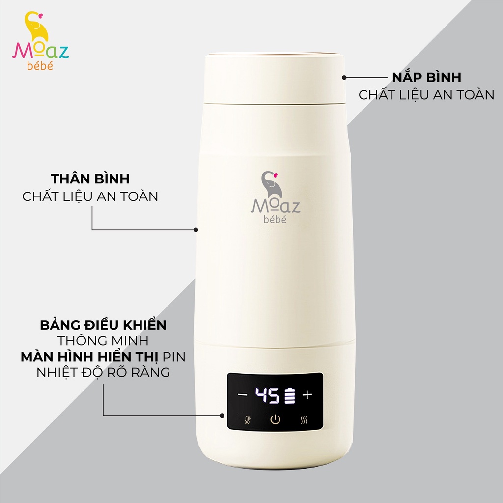 Bình đun nước pha sữa di động mb 058 - Bình đun nước pha sữa di động mb 058 của Moaz BéBé là sản phẩm bình đun di động, thuận tiện để hâm nước pha sữa khi đi du lịch. - Thiết kế nhỏ gọn, màn hình led thao tác dễ dàng và hiển thị nhiệt độ của nước. Dung tích 300ml giúp bố mẹ có thể mang đi mọi nơi, thuận tiện hâm nước pha sữa cho bé. Chất liệu - Vỏ ngoài thiết kế nhựa ABS + nhựa PP cao cấp - Chất liệu bên trong khoang: Inox 316 cao