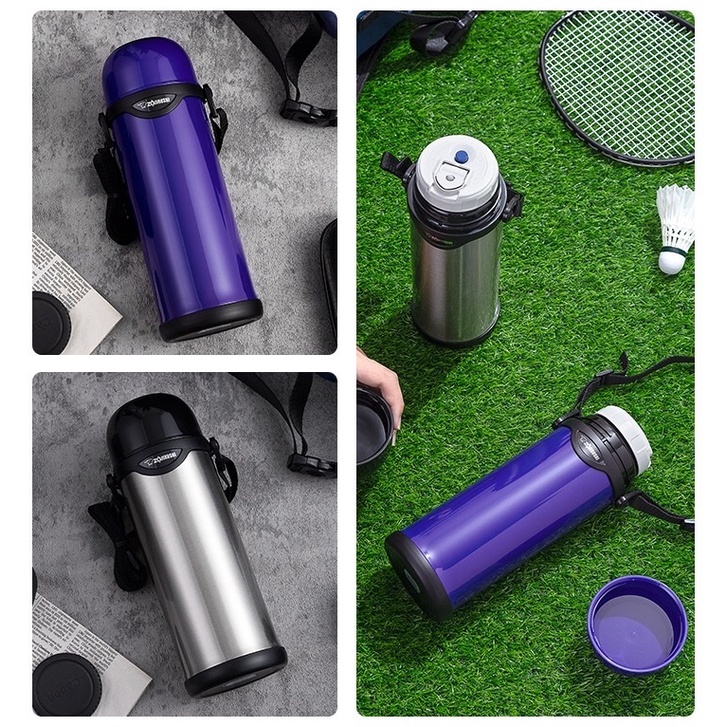 Gồm 1 bình + 3 nắp + túi đựng - Có 3 màu. Chất liệu: inox 304 - Cao: 24cm. DT: 500ml. - Giá sale đẹp: 690K/set