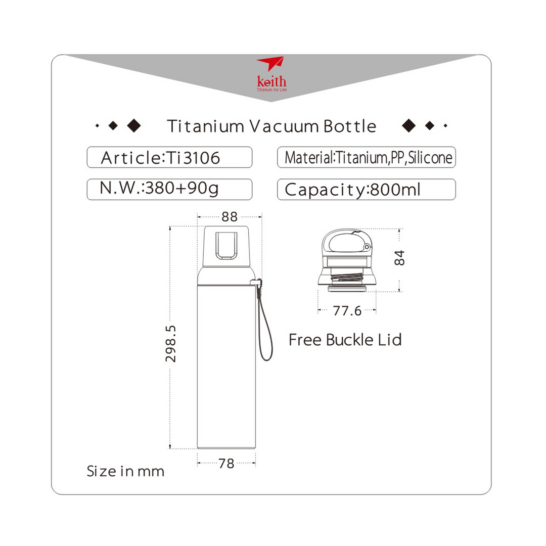 THÔNG TIN SẢN PHẨM: - Thương hiệu: Keith Titanium - Xuất xứ: Trung Quốc - Chất liệu: Titanium - Kích thước: 68 x 227mm - Trọng lượng: 221g - Dung tích: 430ml - Cách nhiệt