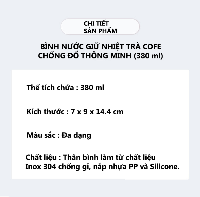 Bình Nước Giữ Nhiệt Trà Cafe Chống Đổ Thông Minh , Vỏ Nhựa , Chất Liệu Cách Nhiệt Inox 304 Cao Cấp , Kiểu Dáng Tinh Tế Năng Động ( 380ml ) CHI