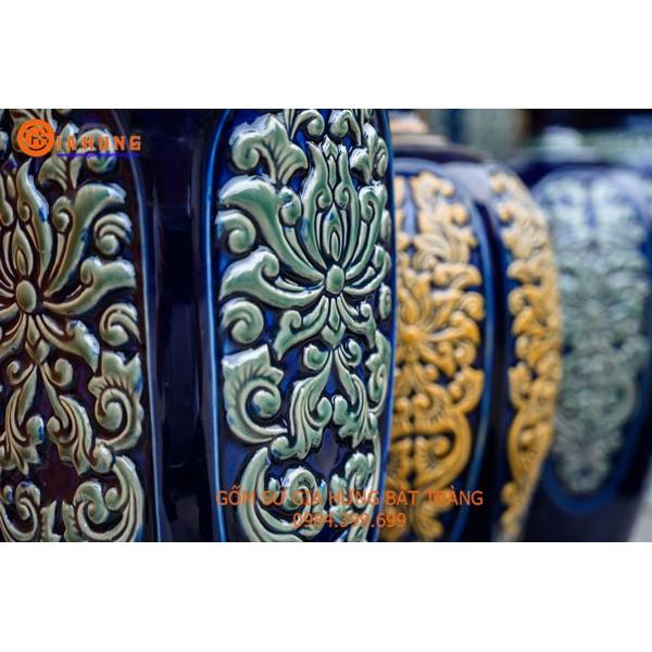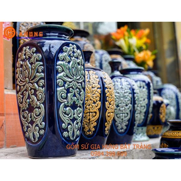 Bình hoa Bát Tràng cao cấp, hàng chuẩn loại 1 với kiểu dáng đùi ếch (phần đáy bình nhỏ, phình to ở phần trên và miệng bình) phối với họa tiết hoa đắp nổi cầu