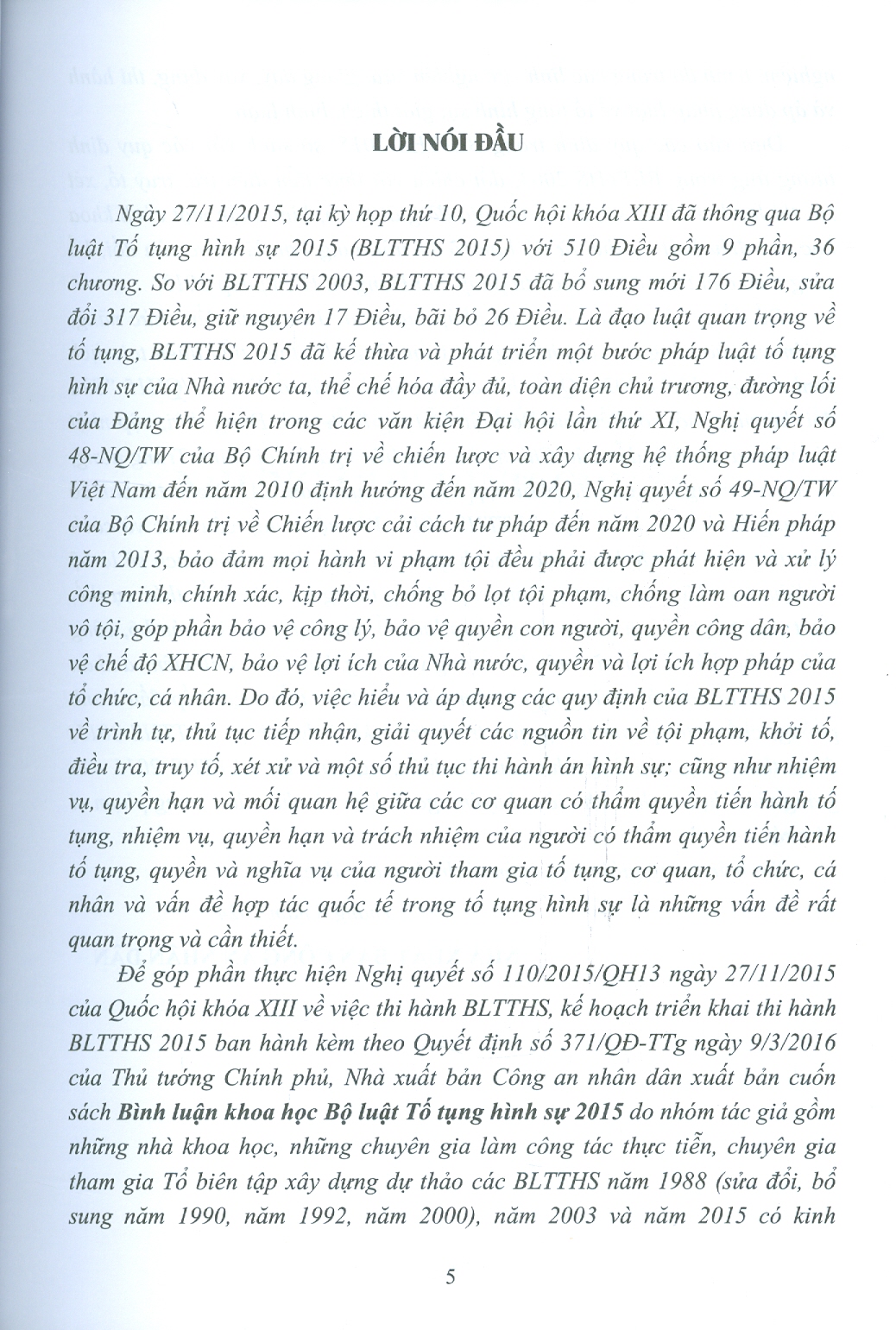 Bình Luận Khoa Học Bộ Luật Tố Tụng Hình Sự Năm 2015 (Tái Bản) Bộ luật tố tụng hình sự 2015 được Quốc hội thông qua ngày 27-11-2015, có hiệu lực từ ngày 1-1-2018. Việc