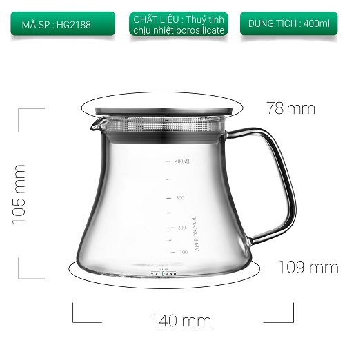 Chất liệu thủy tinh chịu nhiệt (heatproof glass), khả năng chịu nhiệt đến 120 độ C, an toàn sử dụng. Trên thân bình có vạch đo lường theo số tách cà phê (từ 1 đến