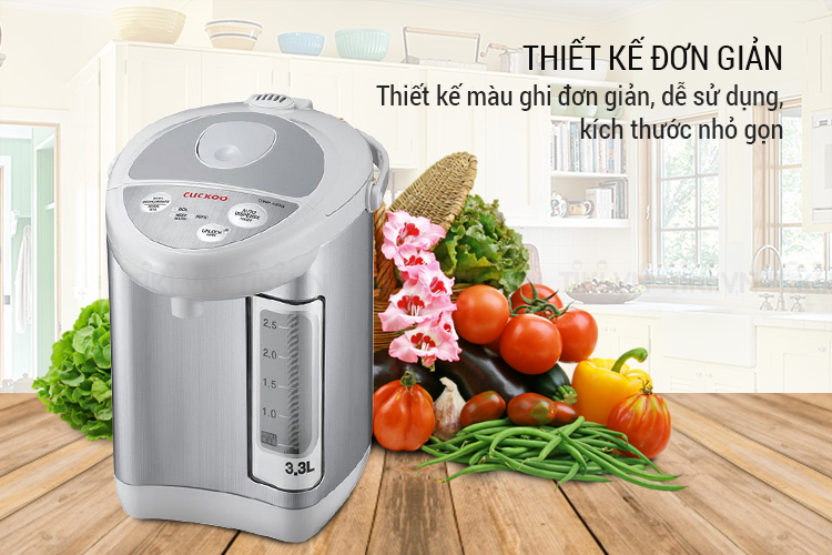Thiết kế đơn giản Bình thủy điện Cuckoo CWP-333G được thiết kế màu ghi đơn giản, dễ sử dụng, kích thước nhỏ gọn nên không chiếm nhiều diện tích không gian sử dụng. Chất liệu cao cấp Thân bình được làm từ hợp kim nhôm cao cấp, có độ sáng đẹp, chịu lực, chịu nhiệt tốt, hạn chế sự bám bụi, giúp chị em nội trợ bảo quản dễ dàng. Chất liệu ruột bình được làm từ inox cao cấp, không gỉ, đảm bảo an toàn sức khỏe người dùng và tuổi thọ lâu dài của sản phẩm. Chức năng tự động giữ ấm Bình thủy điện Cuckoo CWP-333G có khả năng tự giữ ấm ở nhiệt độ 85 độ C sau khi đun sôi mà không cần đun lại, đáp ứng nhiều nhu cầu khác nhau cho mọi thành viên trong gia đình. Điều khiển bằng phím bấm điện tử Hệ thống điều khiển bằng phím bấm điện tử, giúp bạn dễ dàng sử dụng ngay cả khi lần đầu tiếp xúc. Ngoài ra, bạn có thể dễ dàng rót nước bằng nút bơm điện tử, khóa an toàn khi nước đang nấu, mực nước hiển thị để kiểm soát dung tích nước cần thiết.